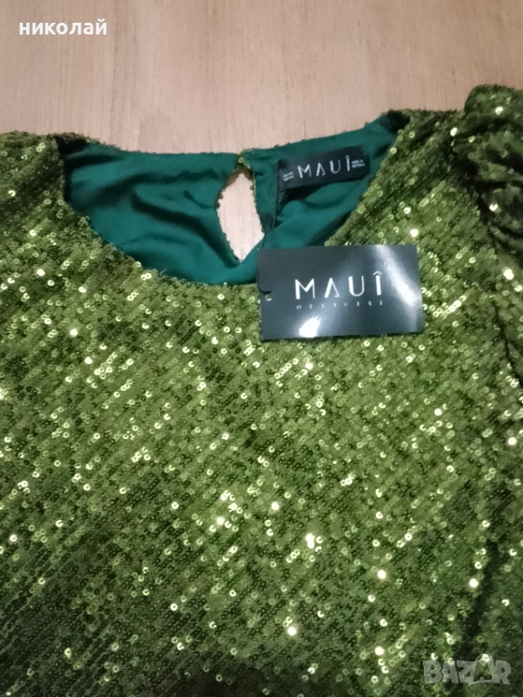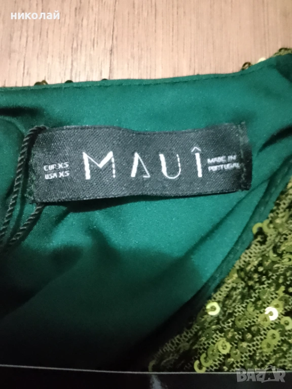 Чисто нова,зелена официална бална рокля MAUI.Идеална за специални събития и тържества.Размер XS.Дължина на роклята 86см,ширина в най-долната част 76см,дължина на ръкава 62см,разстояние от мишница до мишница 44см и разстояние от рамо до рамо 30см.Произведена в Португалия.
