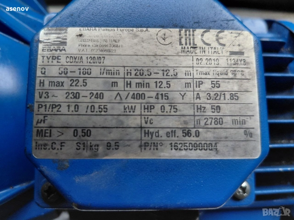 продавам водна помпа с мощност 0,55 кв, 2780 обор/ мин;