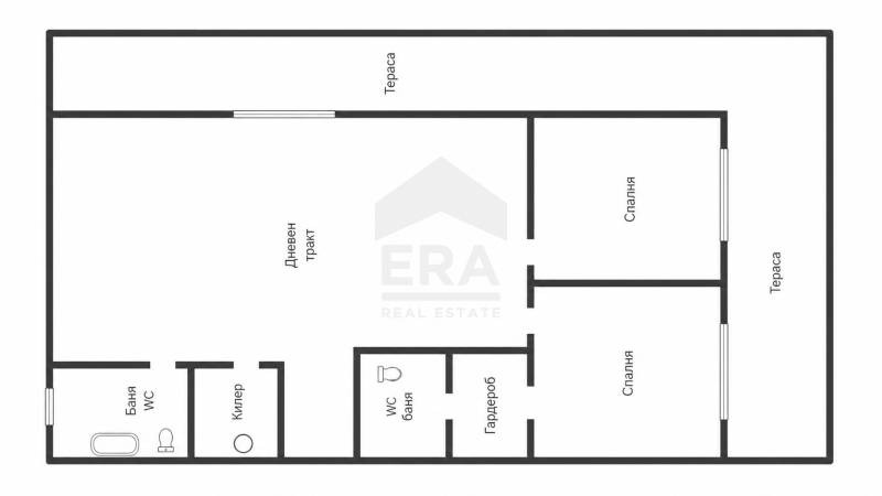 Имотът се състои от хол и голяма кухня с излаз на обща тераса, две спални, всяка с излаз на тераса, Г-образен коридор, килер, две отделни бани и тоалетни, прилежащо мазе ( 10 кв.м).