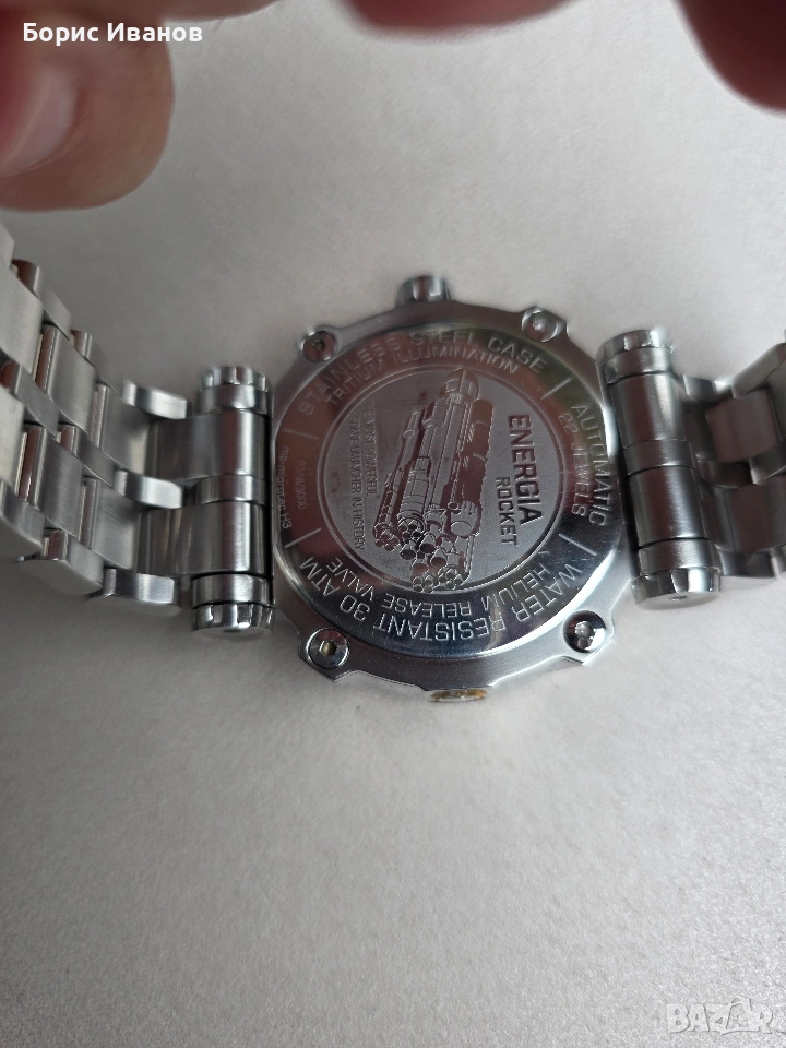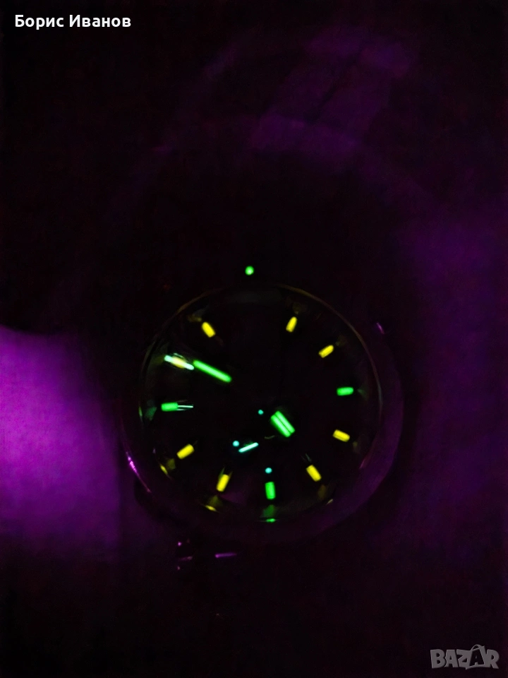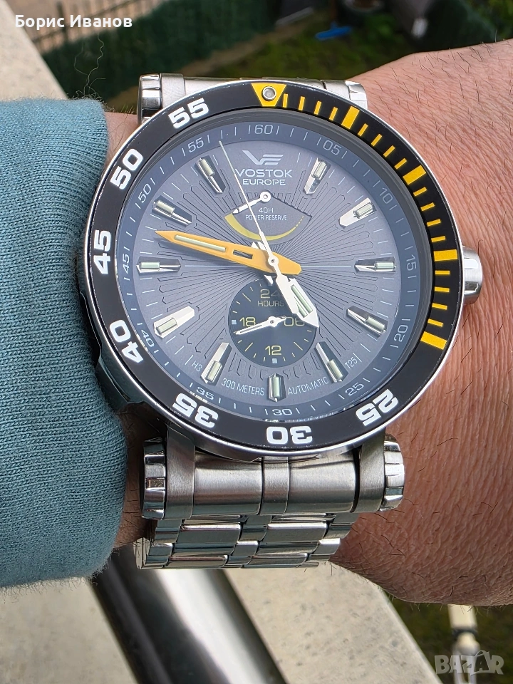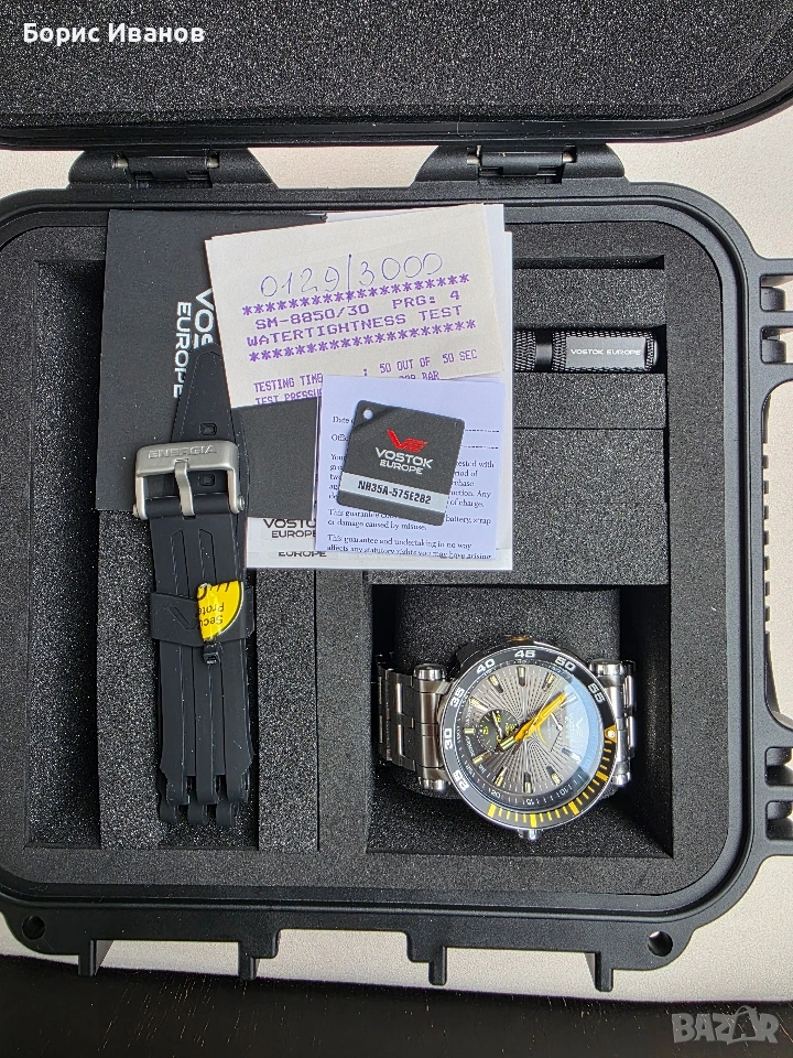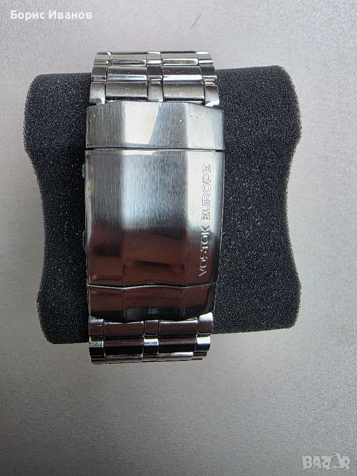 Vostok Europe Energia YN84-575A539 Механизъм: Seiko Epson YN84 automatic Каса: Неръждаема стомана, диаметър: 48 mm Водоустойчивост: 300 метра (30 ATM) Стъкло: Усилено K1 Осветяване: GTLS тритиеви тръби Часовника е в комплект със оригинална стоманена верига и чисто нова гума,оригинална кутия (от големия тип) отверка и съспътстващите го документи.Като цяло часовника в много добро състояние.Цена 480€ като предпочитам лично предаване за град София. Часовниците от серия „Energia“ имат водоустойчивост 30 atm, каса с диаметър 48 mm и автоматичен механизъм NH35. Ето още няколко характеристики: Хелиев изпускателен клапан. Той е еднопосочен, задвижва се от пружинен механизъм и се включва когато разликата между вътрешното и външното налягане стигне определено ниво. Тази функция е подходяща за професионални гмурци работещи на големи дълбочини. Усилено минерално стъкло K1 с дебелина 3.5 mm Прозрачен заден капак Завинтваща се коронка 18 светещи тритиеви тръби, произведени в Швейцария – 13 от тях поставени като индикатори за кръглите часове, 3 на 3-те стрелки и 1 в сапфирена капсула в безела. Две каишки – кожена и силиконова – лесно сменяеми с помощта на отвертка. Целият комплект идва с оригинална водоустойчива и удароустойчива кутия, която може да бъде използвана за съхранение на колекция от 4 различни часовника, 4 допълнителни каишки и отвертка.