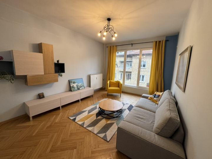 Напълно обзаведен тристаен апартамент на бул. Васил Левски, в близост до ул. Г. С. Раковски. Разпределение: входно антре, дневна с трапезария и кухненски бокс, две спални, баня с тоалетна, отделна тоалетна и балкон. ТЕЦ и климатици. Втората спалня ще бъде обзаведена според нуждите на наемателя. Санирана тухлена кооперация с поддържан вход и вътрешен двор с ограничен достъп.