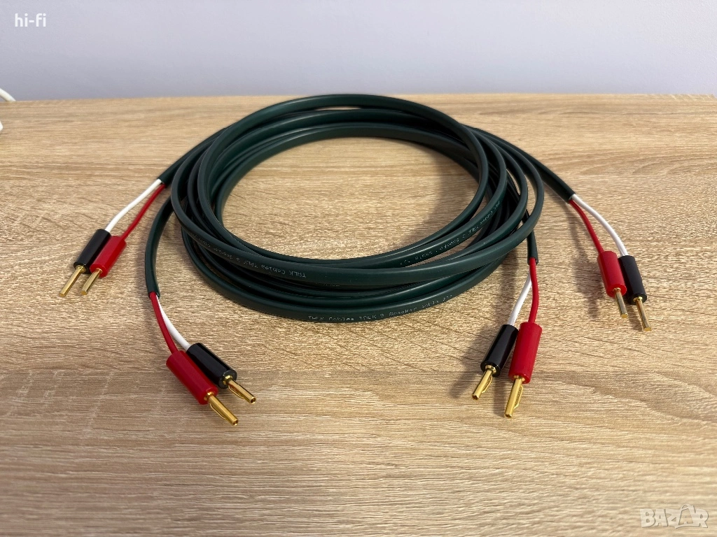 Предлагам чифт качествени кабели за тонколони Talk Cables Talk 3 с дължина 2 х 3.10 метра, произведени в Англия. Дистанционер между двата проводника осигурява прецизно разстояние между проводниците за много нисък капацитет и импеданс. Те са с посока на сигнала и са завършени с позлатени бананови щекери.