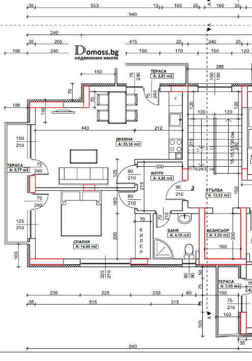 - входно антре с извод за мокро помещение, просторна дневна с кухненски бокс, трапезария и с излас на две тераси, спално помещение с килер и достъп до тераса и баня с тоалетна.