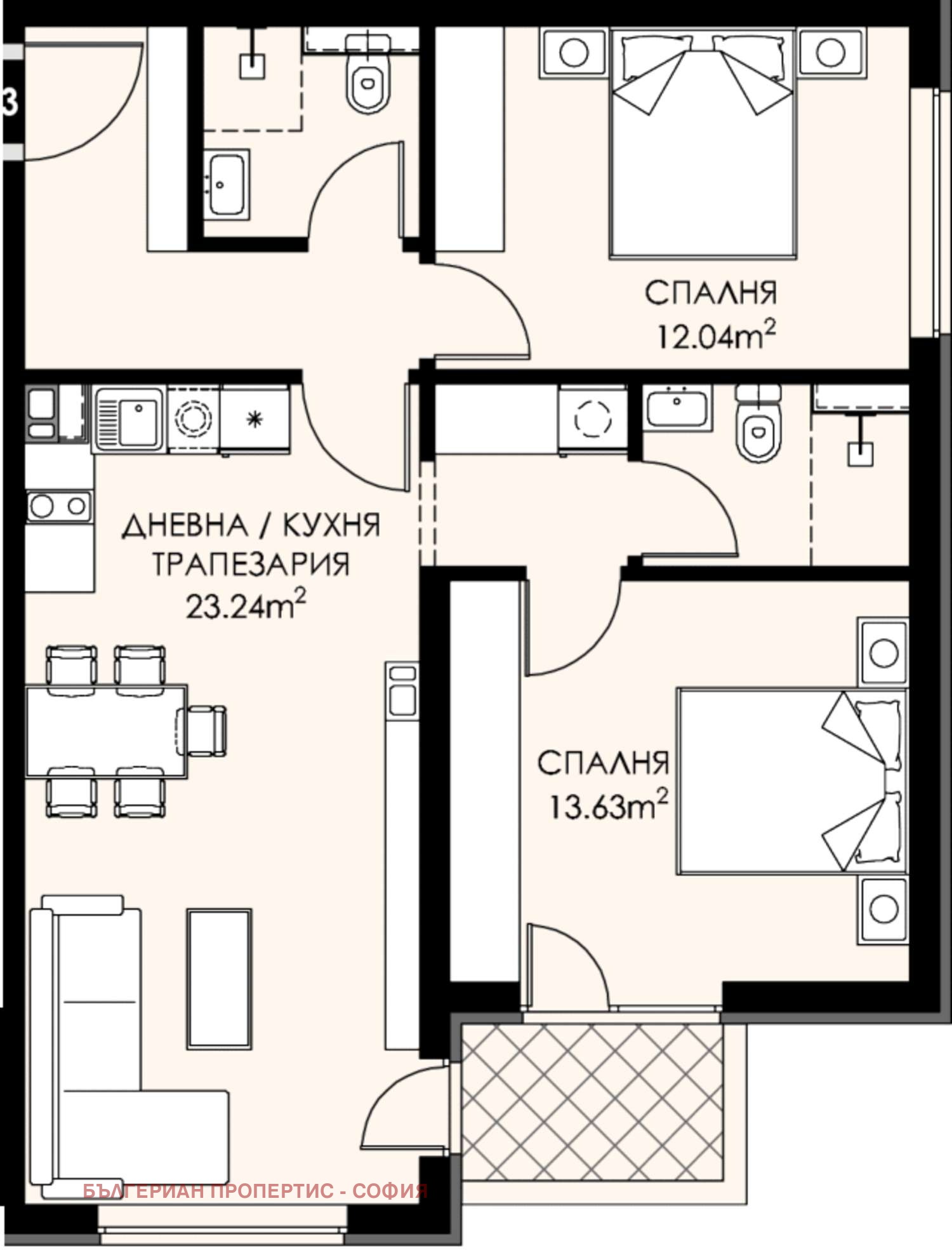 Апартамент A03 , обща площ 94.67 кв.м. (нетна площ 81.22 кв.м.).