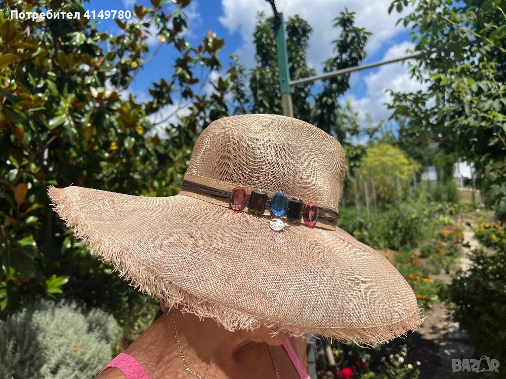 Шапка Patrizia Pepe, нова, размер S, 100% sisal, широкопола шапка за сълнце, кафяв цвят, украсени с камни. Много стилна