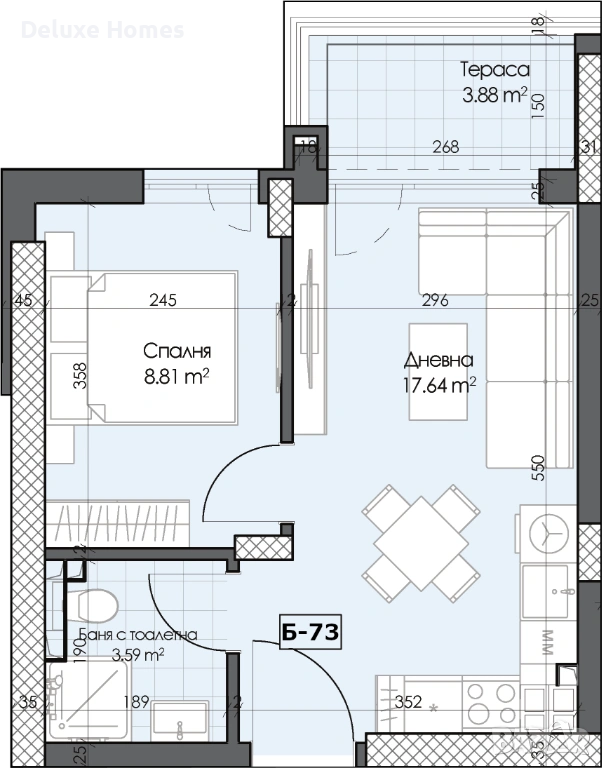 📐 Разпределението включва: Дневна с трапезария, спалня, баня с тоалетна, тераса