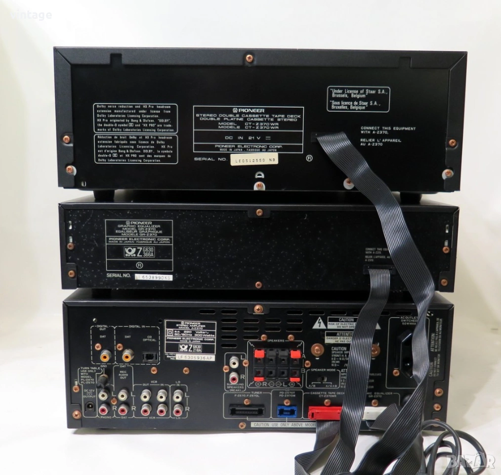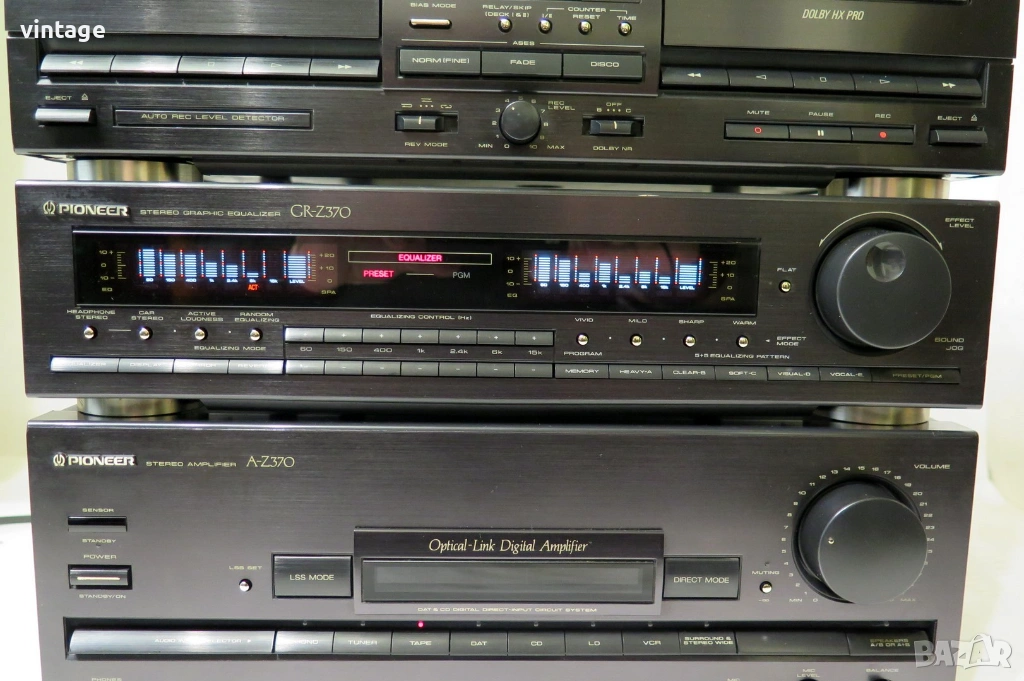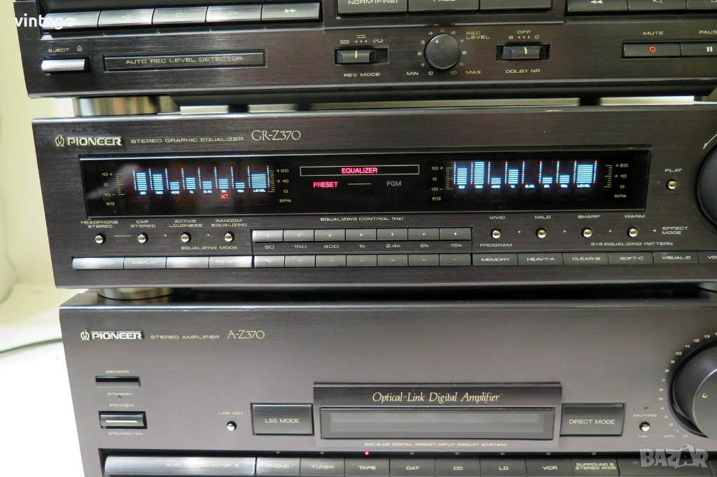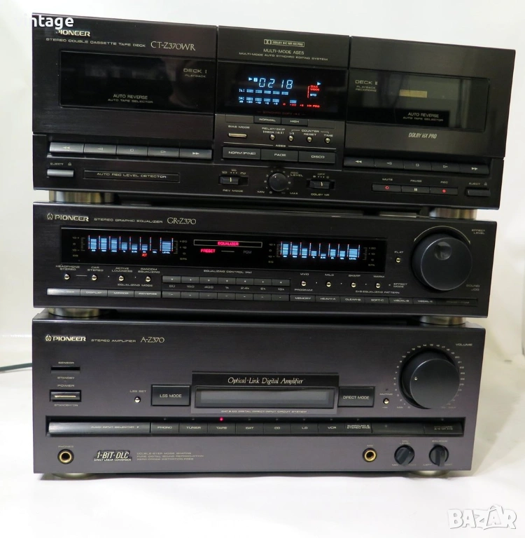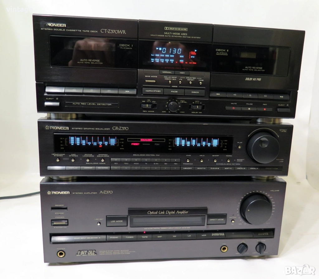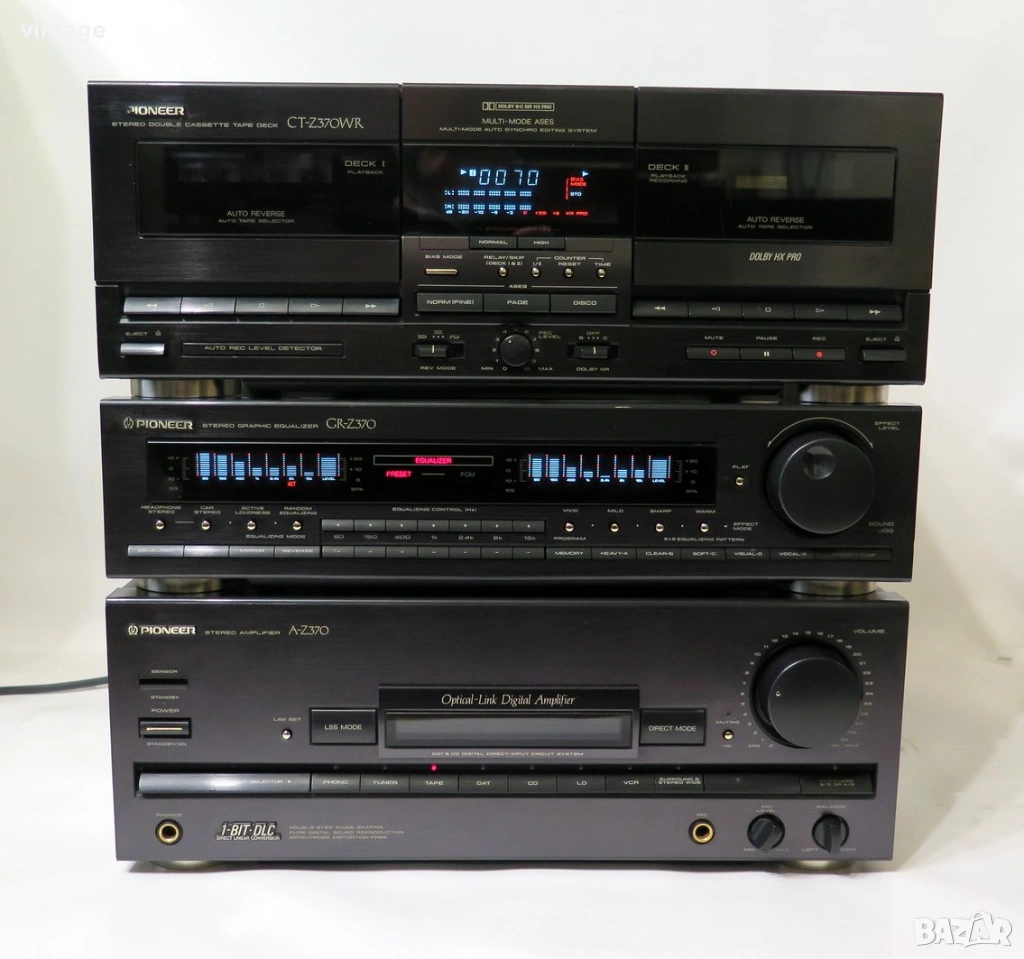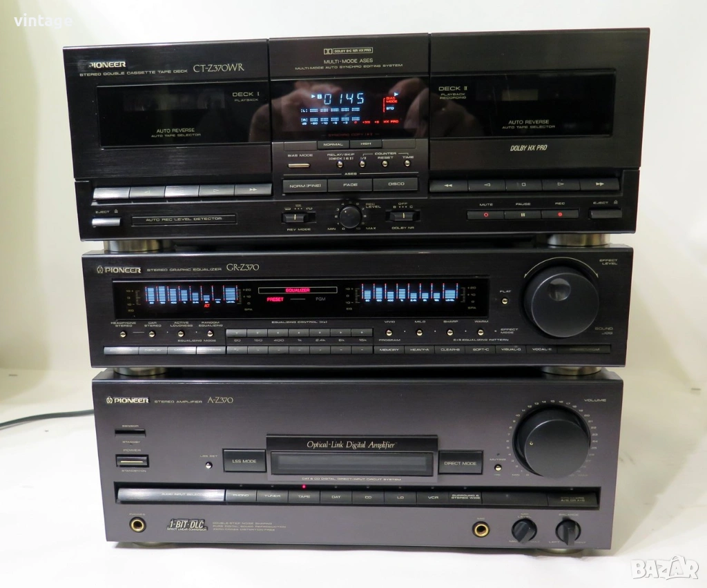 Част от качествена аудио система Pioneer. Състои се от усилвател, еквалайзер и двукасетен дек. Отлична технически, много добър външен вид. Налични всички системни кабели, без дистанционно управление. Приложените снимки и видео са реални!
