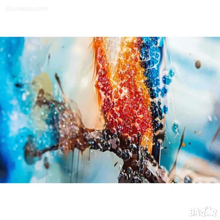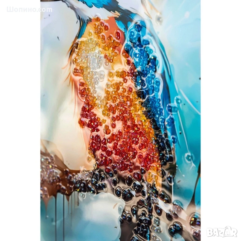 Интензивните нюанси на синьо, тюркоаз и оранжево създават силен визуален контраст, който веднага привлича вниманието. Птицата е уловена в момент на концентрация – баланс между движение и покой. Художественият стил с преливащи се цветове и пръски добавя усещане за свобода и креативност.