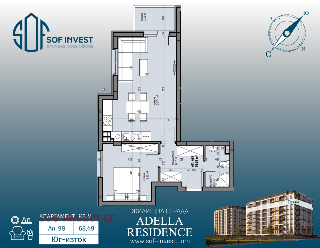 Апартамент А98 - е с площ от 68.49 кв.м и с чиста застроена площ от 58.88 кв.м , и функционално разпределение от коридор, баня + WC, спалня, хол с кухненски бокс и тераса.