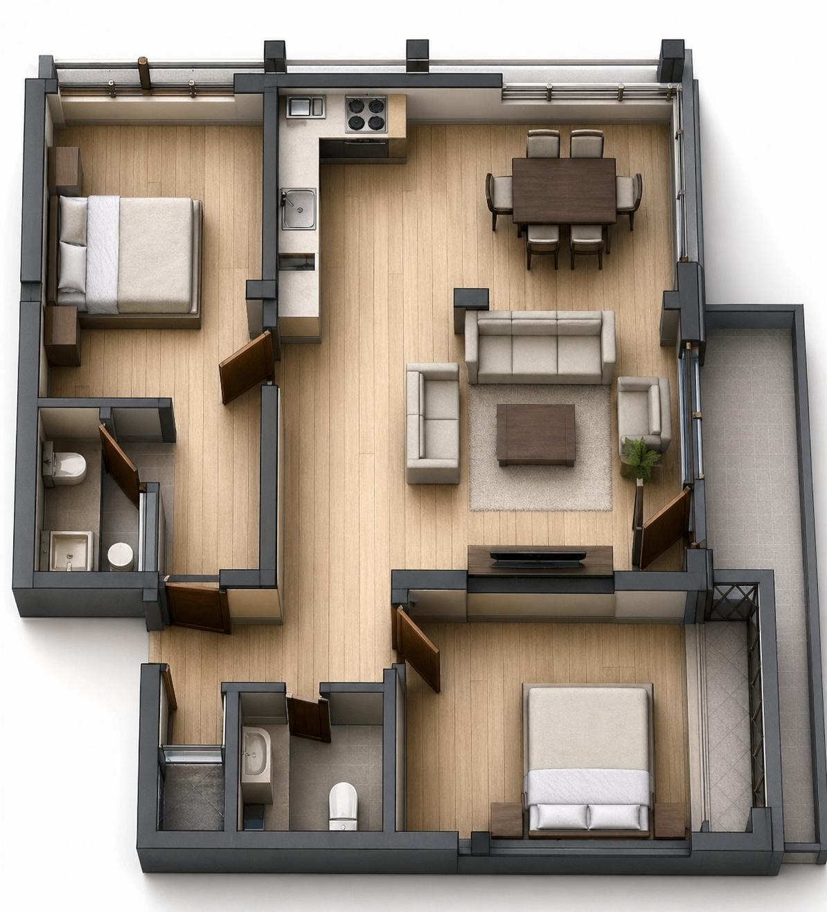 Имотът е ситуиран на 6-ти жилищен етаж и разполага със застроена площ 105кв.м. разгърната в следното разпределение: входно антре, просторен хол с кухненски бокс, две спални, килер, баня с тоалетна, втора баня с тоалетна и две тераси.