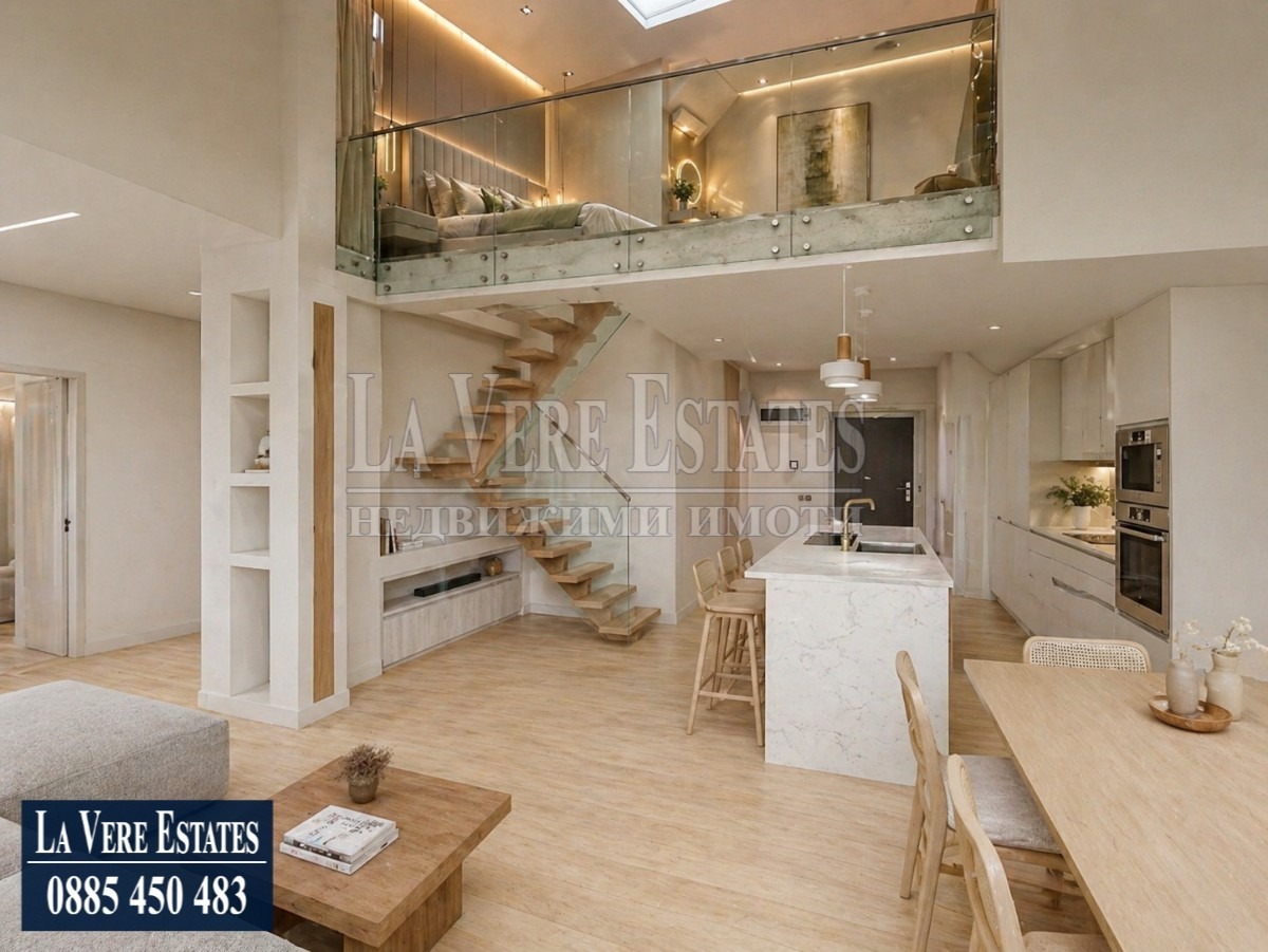 ✅ Дизайн тип Емпоре : Дневна с двойна височина и втора спалня на горно ниво, проектирана със стъклен парапет.