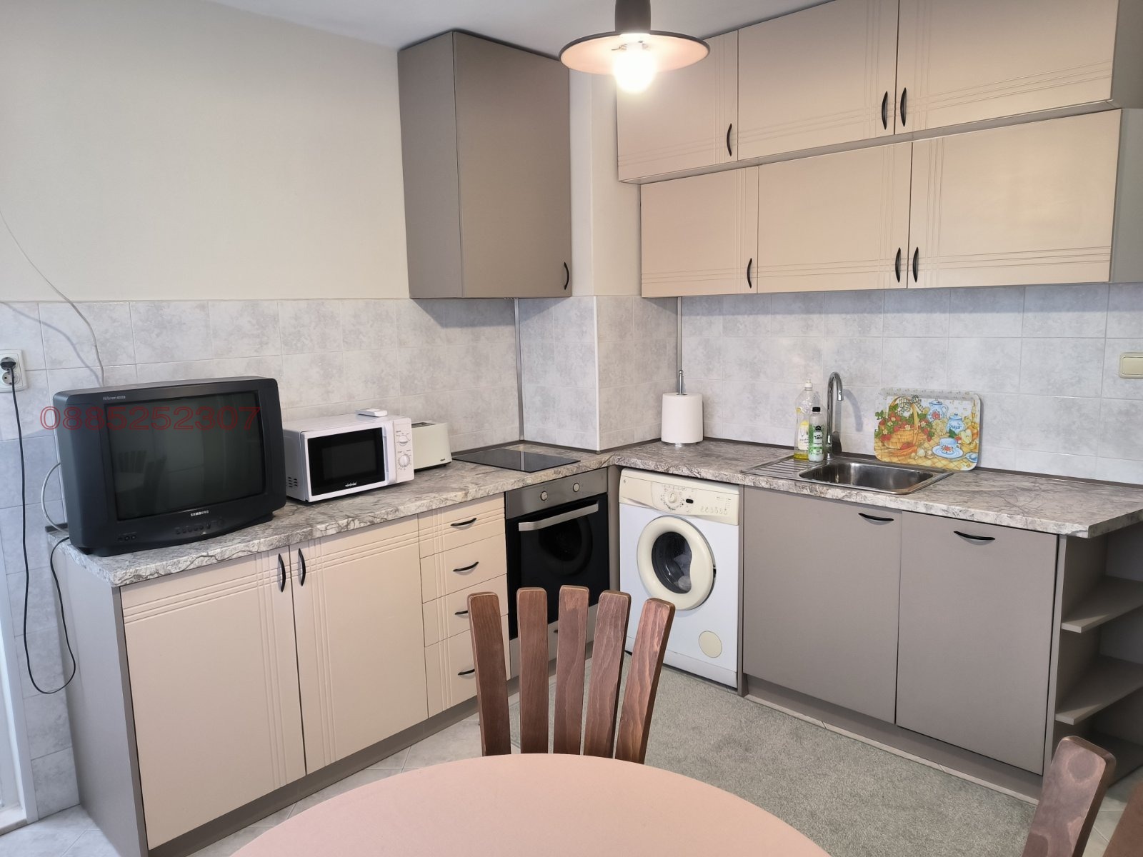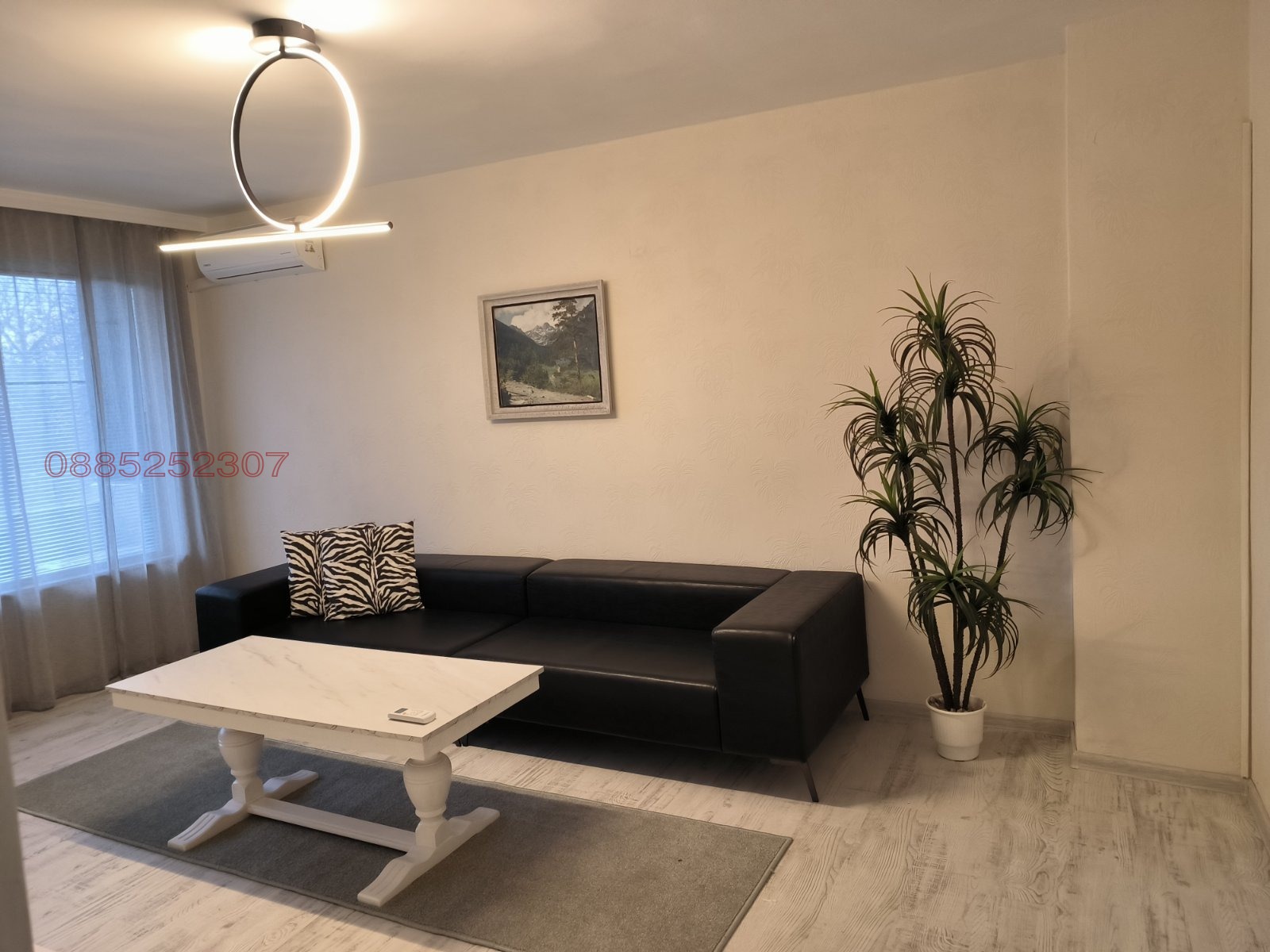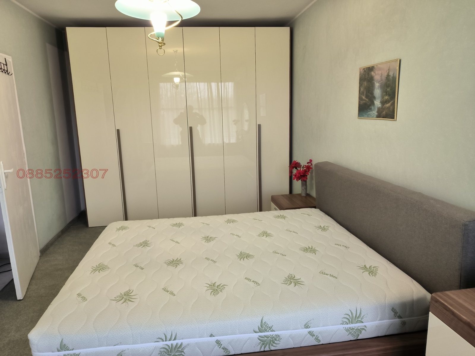 Има две тераси с изглед към Пещерско шосе и младежки хълм,всичко е южно изложение. Оборудвана кухня с нови ел.уреди-фурна,вграден аспиратор,миялна,пералня,хладилник,микровълнова фурна. Спалнята е обзаведена с италиански мебели, с мокет,голям гардероб и телевизор. Голям хол с Тв секция и италиански диван от естествена кожа 3м. В коридора има портманто+вграден гардероб.