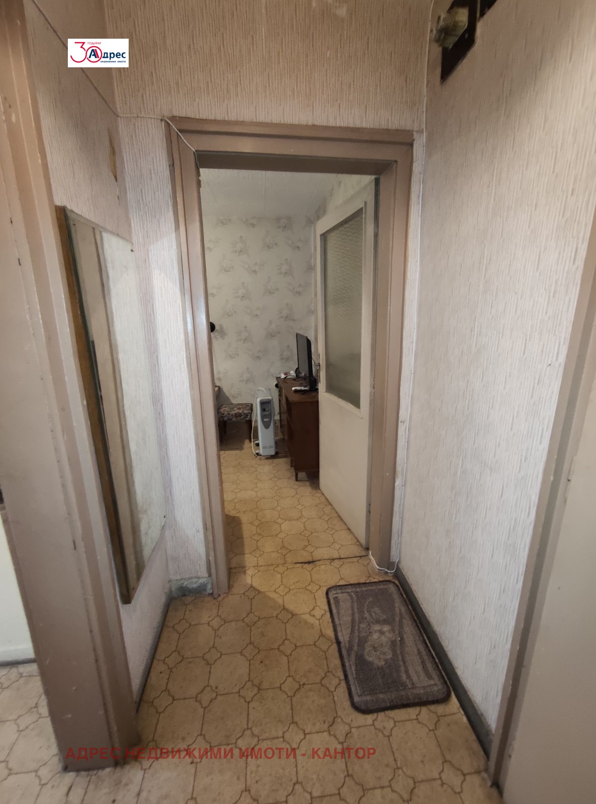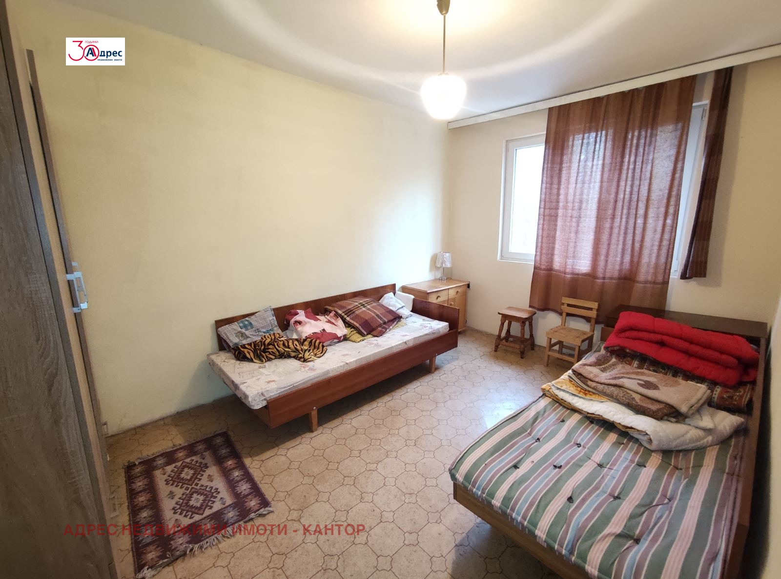 Агенция Адрес продава апартамент в супер центъра на града. Разположен на втори етаж от триетажна тухлена кооперация. Площта му е 43,55 кв.м. Състои се от две стаи и кухненски бокс с усвоена тераса, баня с тоалетна, коридор. Апартаментът е среден с източно изложение. Има две избени помещения. Дограмата е ПВЦ, пода балатум.