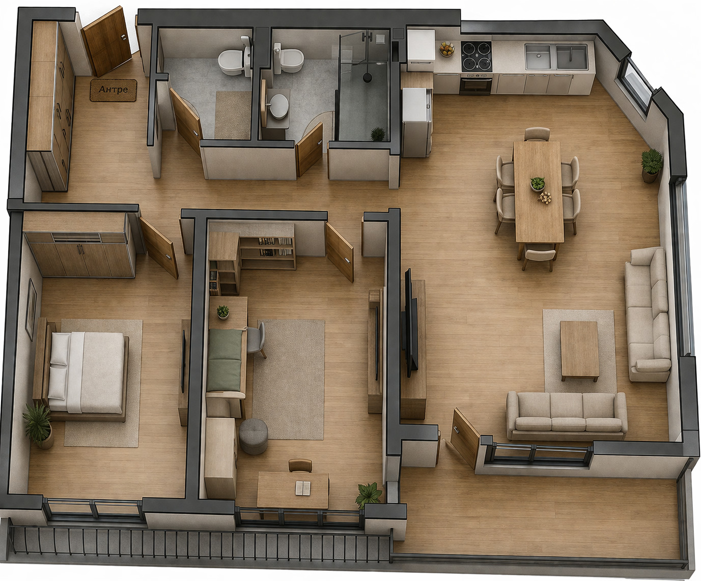 Имотът е ситуиран на 1-ви жилищен етаж и разполага с площ 117кв.м. разгърната в следното разпределение: входно антре, дневна с кухненски бокс и трапезария, две спални, килер, баня с тоалетна, втора тоалетна и тераса.