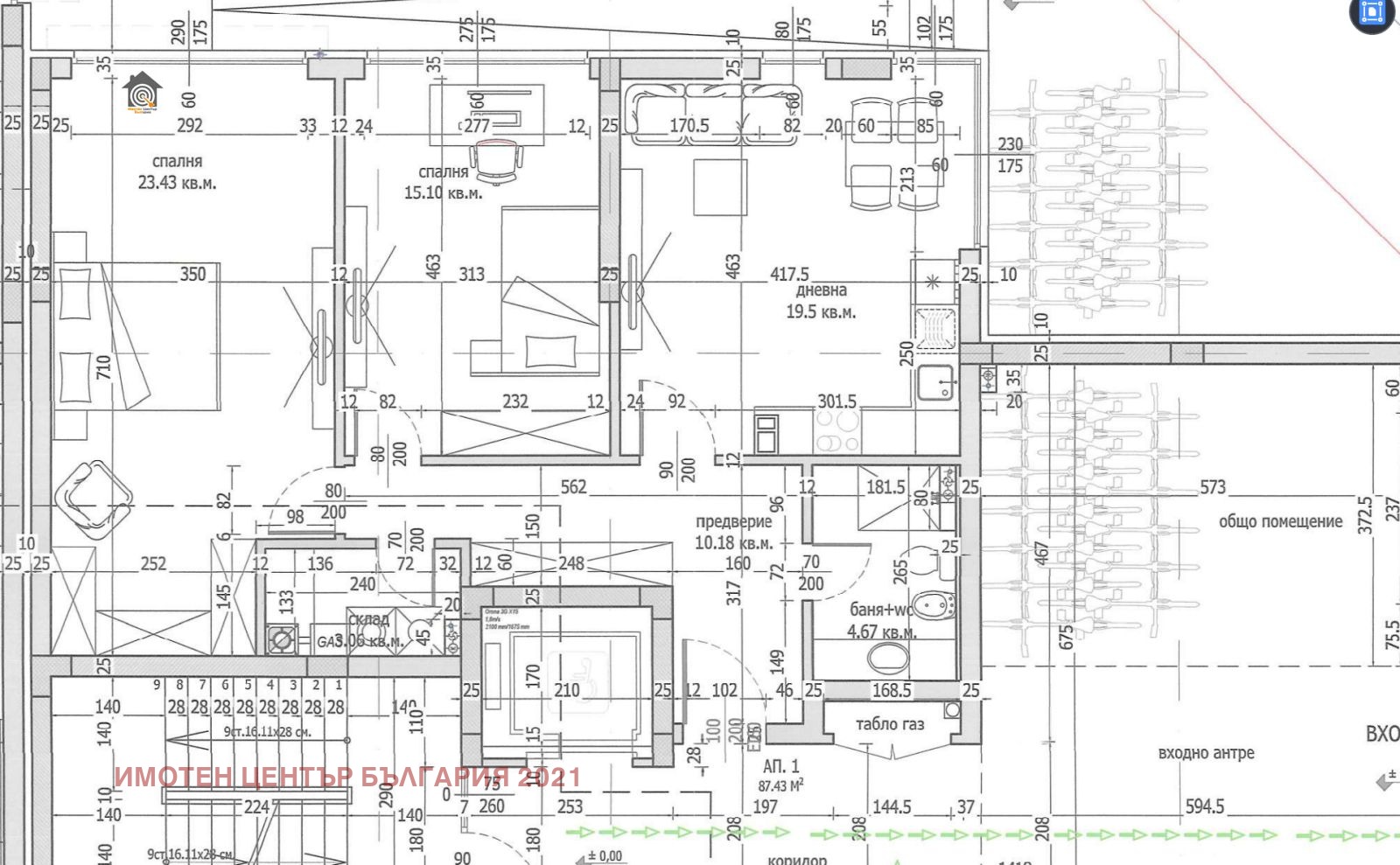 Апартаментът е разположен на партерен етаж и е с чиста застроена 87 кв.м. разпределени в просторен коридор, баня с тоалетка, мокро помещение/склад, 2 спални.