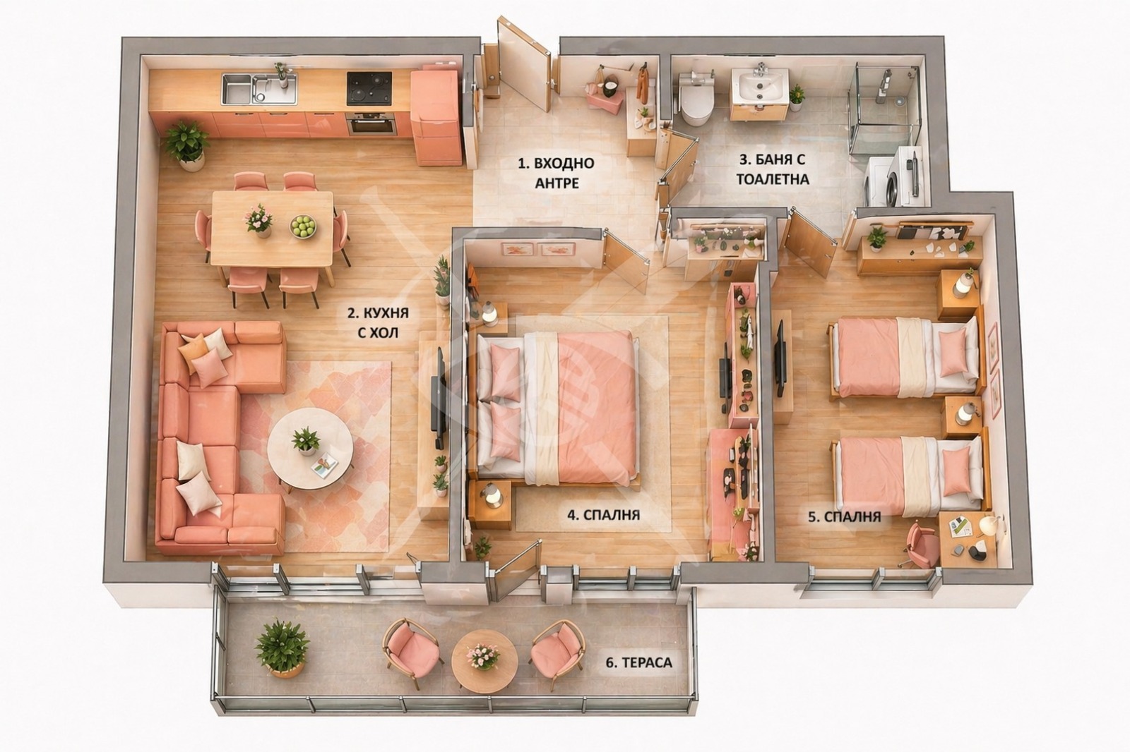РАЗПРЕДЕЛЕНИЕ: Жилището разполага с чиста площ от 80 кв.м., разпределена във входно антре, кухня с хол, две спални, баня с тоалетна и тераса.