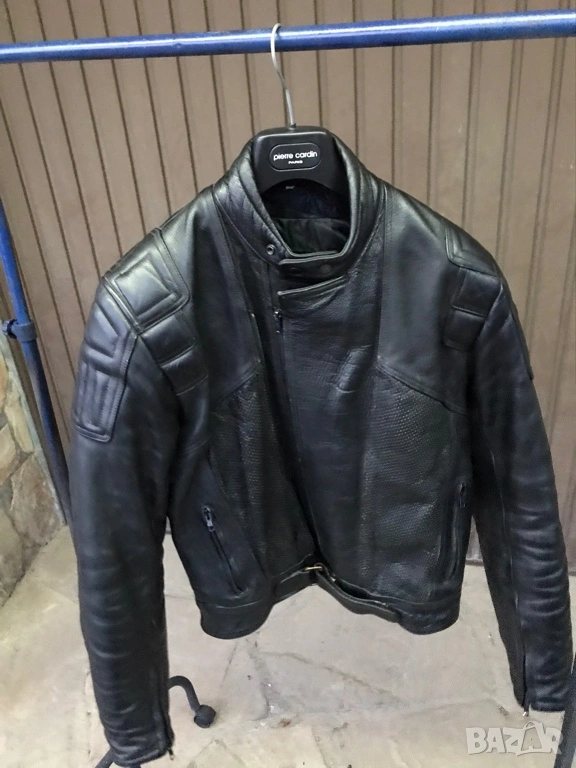 Koжено яке от телешка кожа за мотор,в якео за предпазване на предмишниците им вшити кори,а за раамената също има кори,но те са с опция за сваляне ,има специални отвори където се поставят, Изключително запазено и качествено яке,не е писано с него, размерът е 54 (XL).