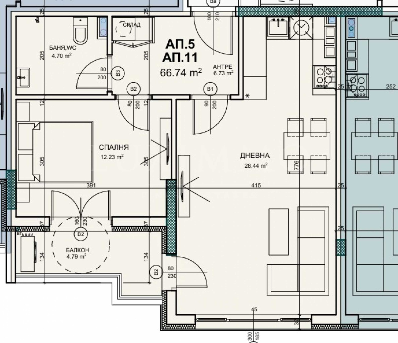 Жилището e с обща площ от 74,53 кв.м, застроена площ - 66,74 кв.м и общи части - 7,79 кв.м. Разположено е на 2-ри етаж, с изложение на запад. Състои се от антре, баня/тоалетна, дневна с кухня и трапезария, една спалня, тераса с излаз от двете стаи.