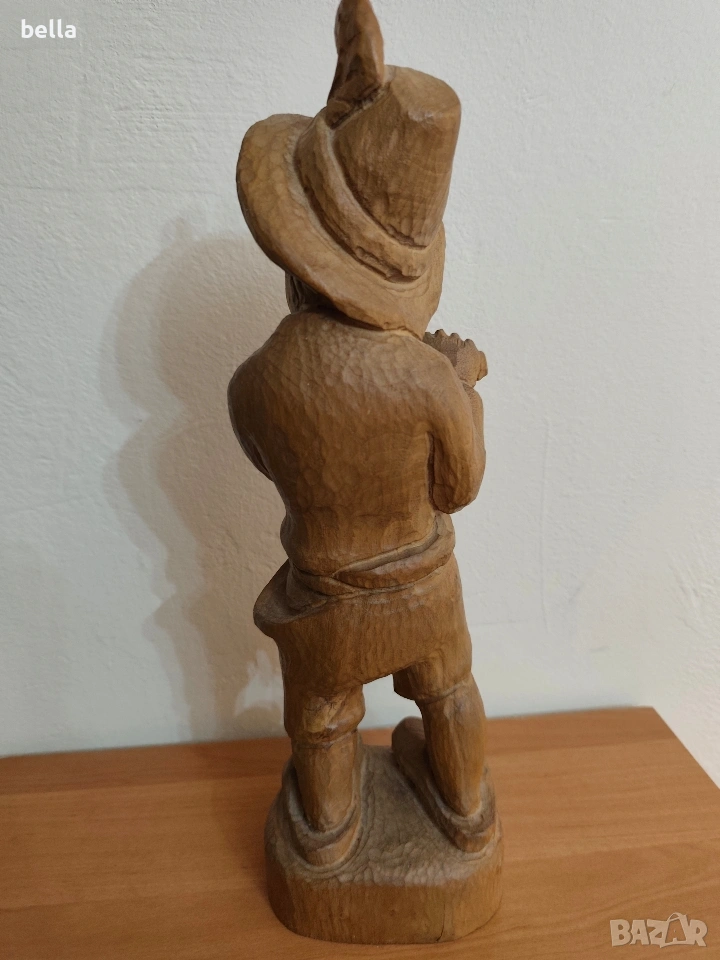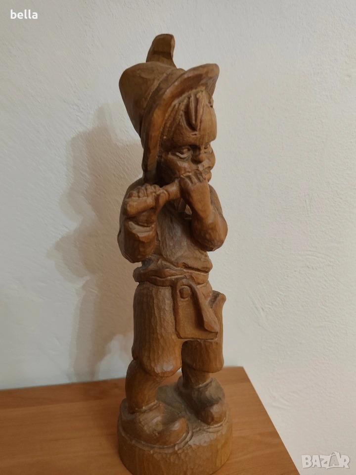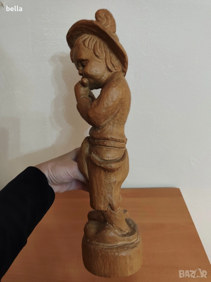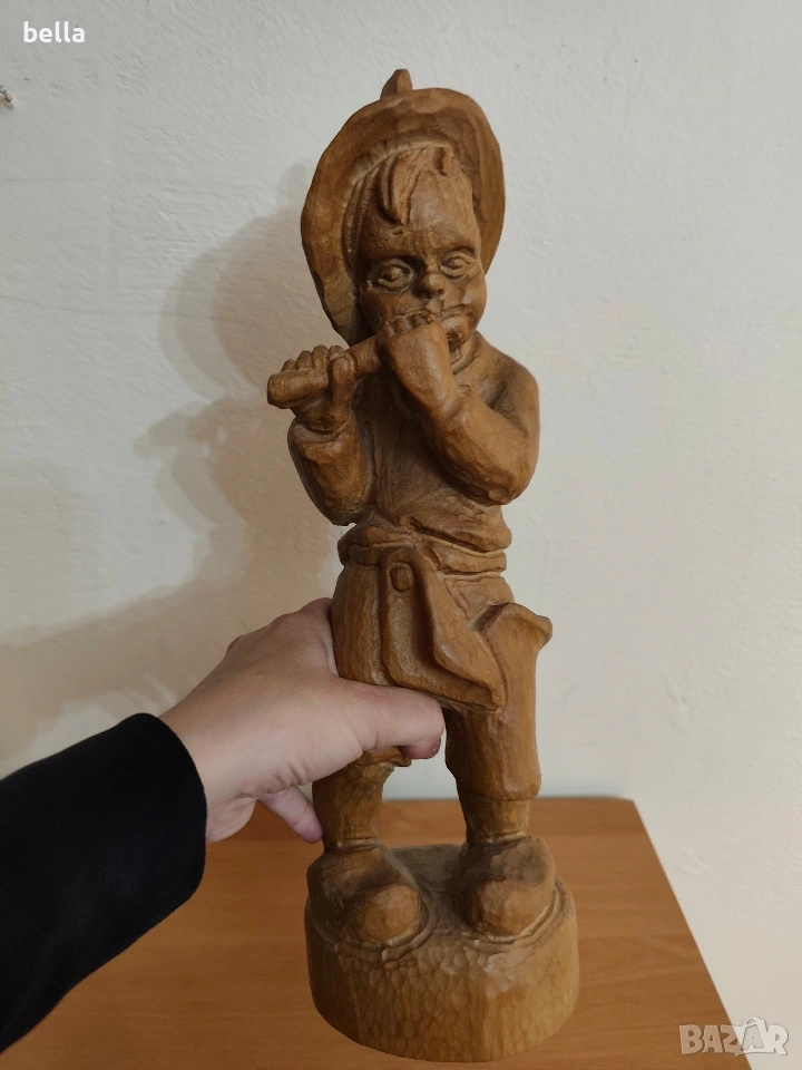 МАЙСТОРСКА ПЛАСТИКА (Овчарче с кавал) Красива, ръчно изработена скулптура от дърво, изобразяваща овчарче, свирещо на кавал (флейта). Фигурата е изсечена от масивно дърво с подчертана текстура и е в класически битов стил.Височина 40 см. Естествено дърво, изцяло масивно.Фина, дълбока дърворезба. Виждат се длетата на майстора по детайлите на шапката, дрехите и лицето, което й придава неповторим автентичен дух.Цена 50 евро