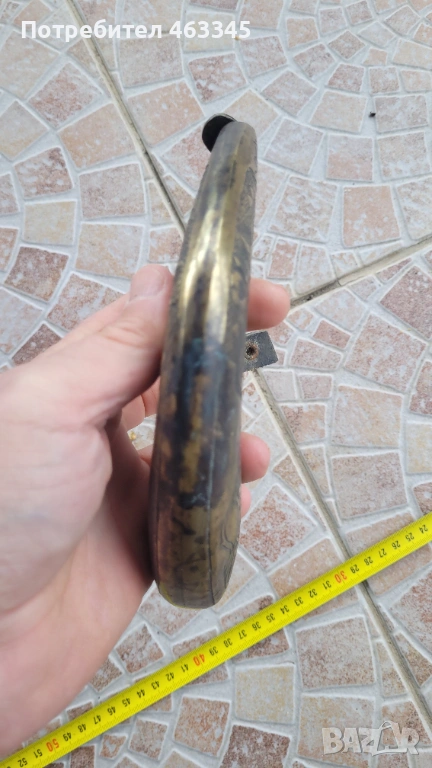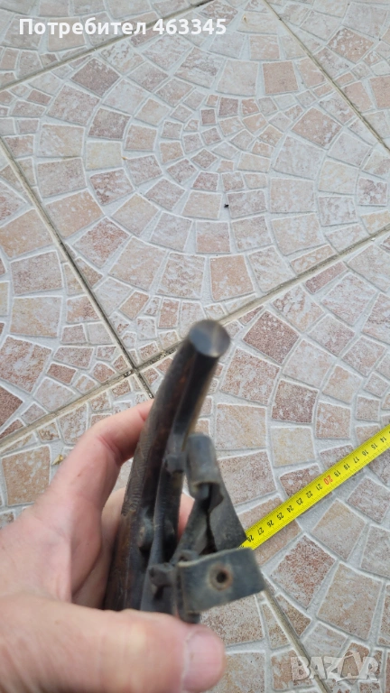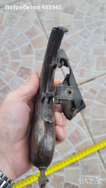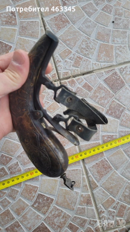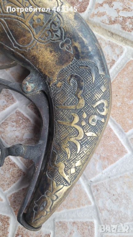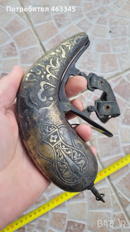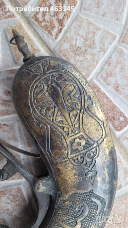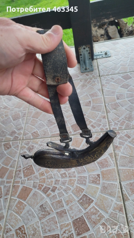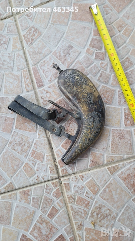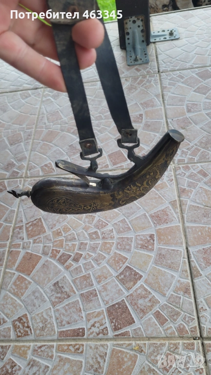 Старинна османска барутница. Изработена е ор бронз, датирана, с надписи с арабски букви, които не разбирам. Непочиствана, покрита с дебела патина. Окачена е на оригинална кожена подвеска за колан. Няма очукано и подбито, няма спукано. Капачето работи, пружинката му е все още читава