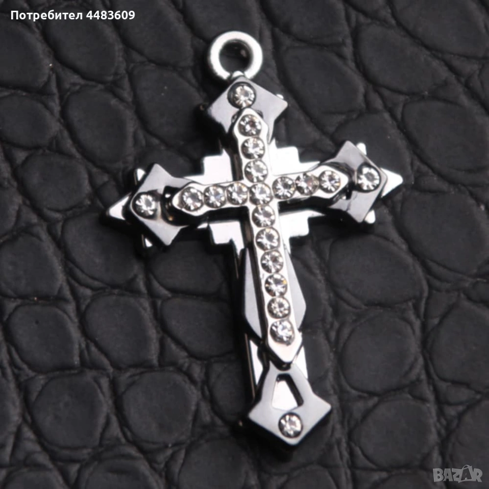 Колие " Троен Кръст " с ланец , изработени от титаниева стомана , не потъмнява , може да се мокри . Колие под формата на три различни кръста един върху друг , украсени с бял кубичен цирконий . Ланец изработен от същия материал с дължина 60 см и дебелина на плитката 3 мм . Общо тегло 17.2 грама . Изпращам с куриер по ваш избор с опции преглед и тест преди плащане . Моля разгледайте и другите ми обяви , Благодаря .