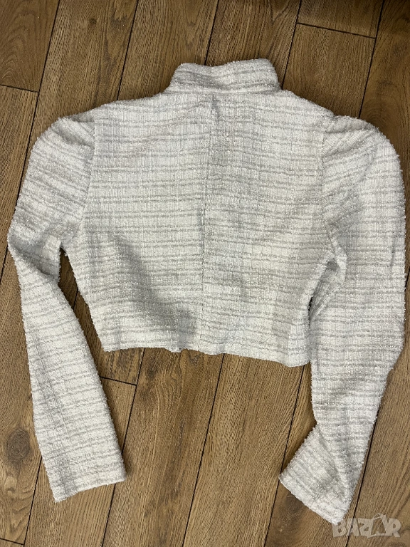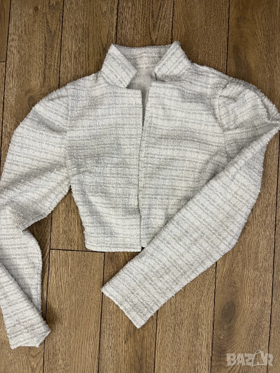 Елегантно дамско късо сако/яке, което е подходящо както за ежедневна, така и за официална визия. Има леки сребристи нишки, еластично е. Ракавите са дълги, малка яка и леки буфон ръкави. Отворено е, не се закопчава.