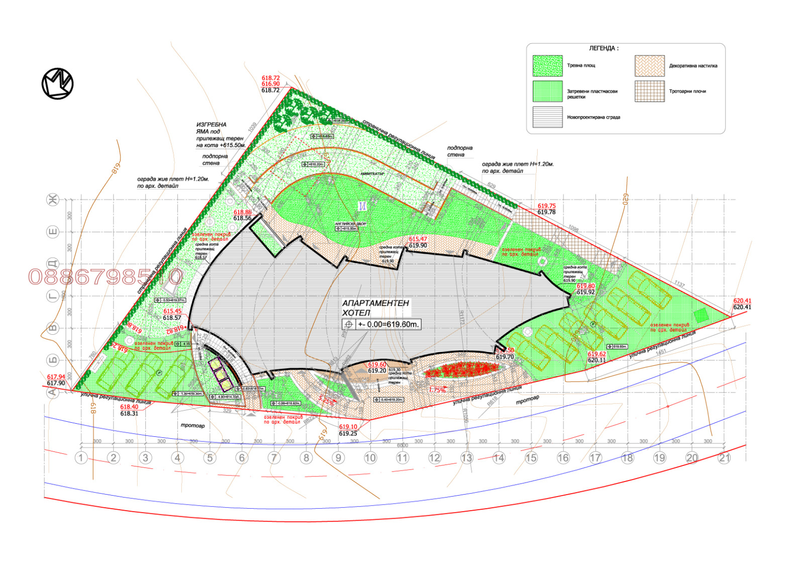 Парцелът разполага с изтекло разрешение за строеж на апартаментен хотел с РЗП 2000 м2. За проекта има и протокол за открита строителна площадка. ОТСТОЯНИЯ по въздух. 200м до резиденция Софарма. 300 м до Mountain View Village. 400м до Англо-американско училище. 2 км до Бизнеспарк София. 2 км до Панчаревско езеро и начална станция Симеоновски лифт. Ако желаете, в цената включвам и работния проект за апартаментния хотел. Парцелът е подходящ например за: 1) Луксозна жилищна сграда (с възможност за ресторант, кафе, СПА, магазини, галерия, терапевтични кабинети и т. н.). 2) Фитнес център. 3) Апартаментен хотел (сигурно запълване от Англо-американско училище и Бизнеспарк София). 4) Семинарен център/шоурум с хотелска част, ресторант и СПА. 5) Интернат или сграда за настаняване на персонала на Англо-американско училище (интерес от страна на училището след проведен разговор с ръководството). 6) КЛИНИКА. 7) Старчески дом от висок клас и др. Възможност за БАРТЕР срещу готова къща (до ключ) в южните райони на София. Обезщетение по договаряне. Контакт собственик:
