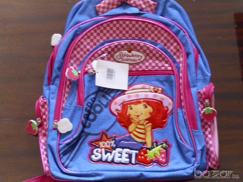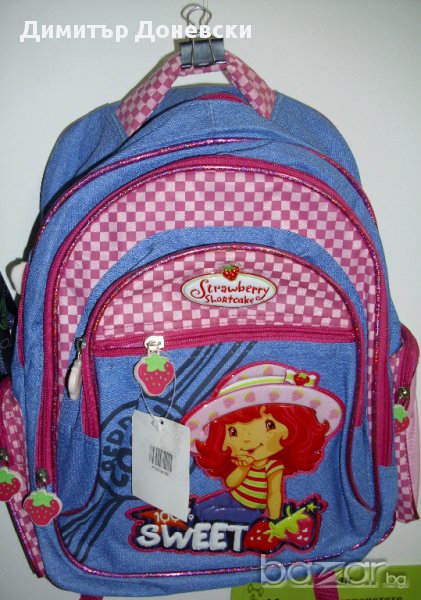 Продавам ученическа раница от дънкова материя 'Strawberry Shortcake'. С дръжка, с презрамки и с шест ципа - две странични джобчета, три отпред и един най-голям отзад по средата на чантата. Произведена в Китай. 2008 г.
