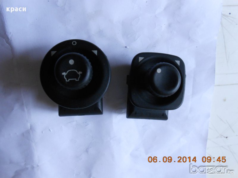 рено еспейс 2 -15лв ::: панел с копчета ел. огледала и халогени за алфа ромео 156 -20лв ::: копче ел. огледала за фиат улисе/пежо 806/ситроен евазион -15лв ::: копчета ел. огледала за ланчия капа -15лв ::: опел астра ф / тигра а / корса б / вектра а/ омега а-б / калибра / сенатор -15лв :: опел астра г / зафира / вектра б -20лв ::: крайслер вояджер 94г -20лв :: ситроен ксантия -10лв :: Мерцедес 201/124 -20лв :: алфа ромео 145/146 -10лв :: фв голф 3 -10лв ::: мазда 323 ф 98г -15лв ::: ровър 200 -15лв ::: фиат темпра -10лв ::: хонда акорд 97г -15лв ::: хюндай лантра / елантра 97г -20лв ----- доставка 6.60лв