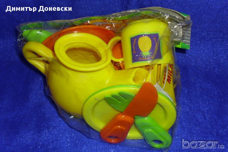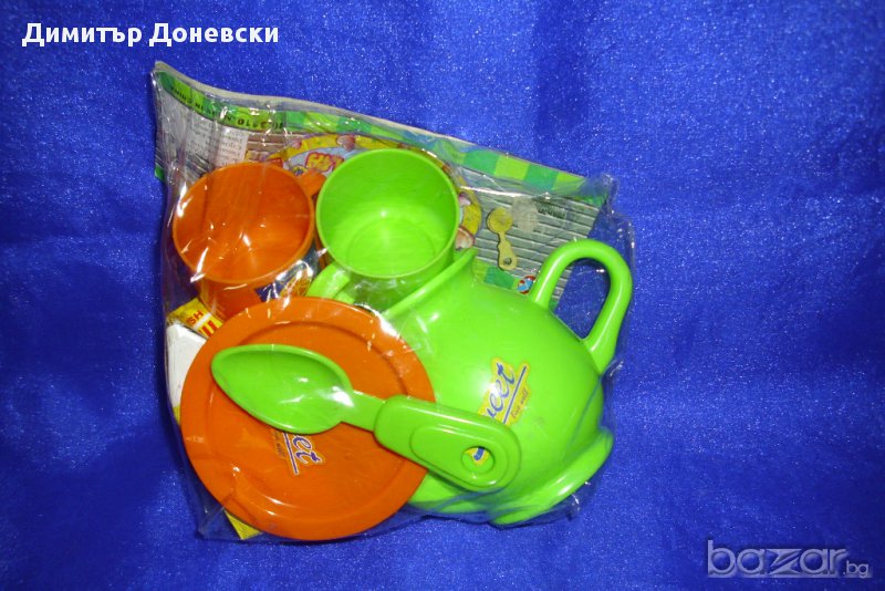Продавам детски пластмасови сервизи, състоящи се от каничка, две чашки с чинийки, ножче, виличка, лъжичка и пакетче плодово мляко. Подходящ е за детски градини и занимални, за детски кухни и детски вили.