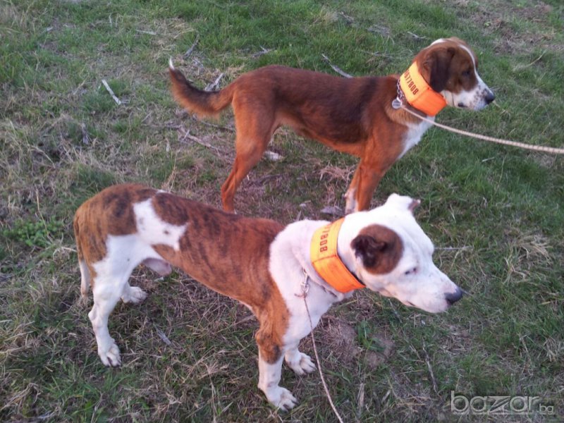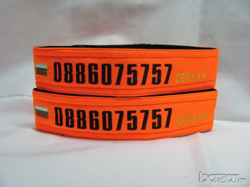 ловни кучета. Не е предназначен за повод. Използва се с превантивна цел от "приятелски огън". Носейки сигналния нашийник кучето се забелязва отлично на пределни дистанций. Бродерията на личният Ви тел.номер и име дава възможност да Ви открият в случай, че кучето се изгуби и бъде намерено от съвестен човек. Лицевата част е изработена от здрав хидрофобиран плат, вътрешната част е от полиестърна лента. Закопчаването е със стабилно велкро. Може да се пере, като това не оказва влияние на яркият цвят и на закопчаването. Всички символи по нашийника са везани.