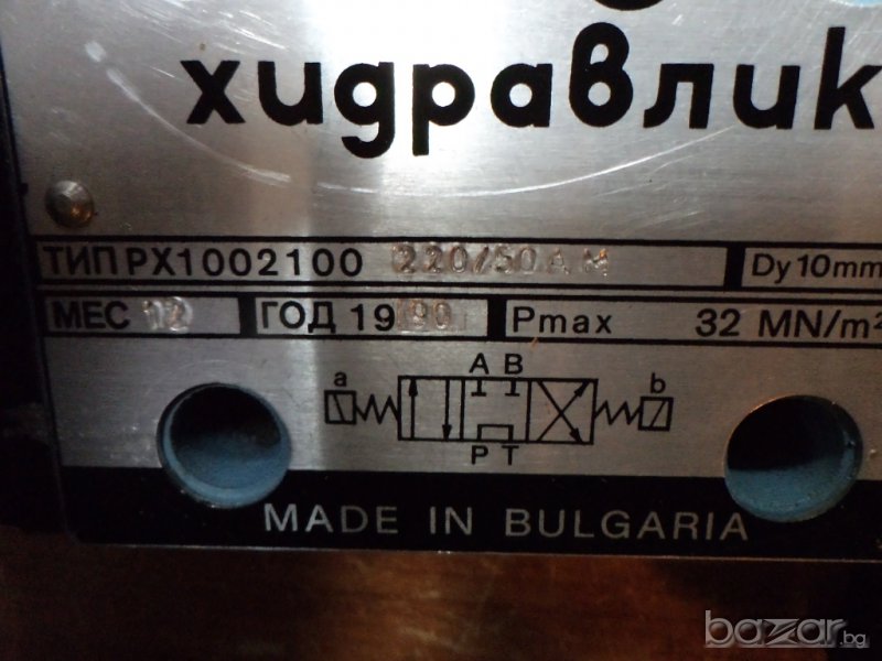 4бр. български, хидравлични разпределители ТИП РХ 1002100 ДУ 10 mm, 32Nm/m2. Бобина 220V/50Hz, според изискванията на клиента бобините могат да бъдат сменени с бобини 24V/DC.