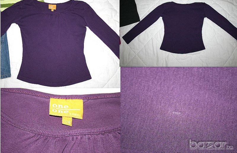 В. Цена 0,50 евро. Блузка One by One - лилава. 100% памук. С минимални следи от употреба по материята и забележка - малка точка от лепило отзад на десния ръкав, пада се под лакътя. Дължина: 45,3 см.; Мишници: 38,5 см.; Ръкав: 48/37,5 см.