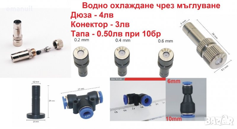 Финни дюзи и конектори за водно охлаждане чрез мъглуване и поддържане на влажност в терариуми и други подобни места.