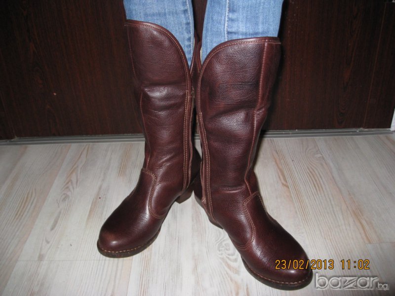 Ботуши от естествена кожа,тъмнокафеви с неплъзгаща се подметка. Вътре имата каракул,много топли.Токът е висок 5 см.