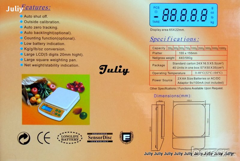 Прецизна, електронна, кухненска везна SF-400A. Четири разреден дисплей големи цифри 20мм височина с точност до 1 гр / либра. Максимално теглене до 7 кг (6 кг). Автоматично изключване на захранването при не ползване за икономия на батерията. Автоматично нулиране. Възможност за външна калибриране. Режими: гр / Lb / Оz . Функция нето / тара. Осветление на дисплея и възможност за изключването му. Индикация за изтощени батерии. Батерии 2 х 1,5V тип AA (включени в комплекта). Възможност за външно захранване 9V, 100mA AC адаптер (не е предвиден в комплекта). Обърнете внимание на това, че не е препоръчително да претоварвате везната с по-голяма маса от допустимата, за да не я повредите. Тя тегли с много висока точност и дава реални резултати.
