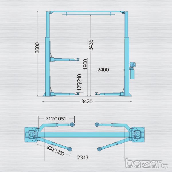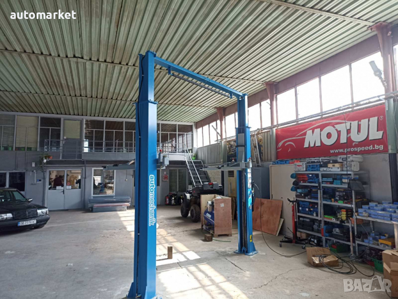 Описание: Асиметричен модел на рамената. Автоматично заключване на рамената при повдигане. Повдигателна система от два хидравлични цилиндъра и вериги. Предпазни ключалки блокиращи количките спрямо колоната. Синхронизиране между количките чрез въжета. Защита от претоварване на помпата чрез байпасен клапан. Защита от прекомерно вдигане чрез крайни изключватели. Товароподемност 4000 кг. Електрозахранване 220 V / 380V. Мощност на електродвигателя 2,2 kW. Работна температура -10 С +50 С. Работна среда Закрито. Относителна влажност lt; 90 %. Габаритна височина 3600 мм. Габаритна широчина 3420 мм. Максимална височина на повдигане на автомобила 1900 мм. Минимална височина на рамената със захватите 125 мм. Разстояние между колоните 2800 мм. Максимално време за повдигане 50 сек. Максимално време за спускане 24 сек. Максимален шум 70db (A). Тегло 780 кг. Материал 8мм закалена висококачествена Стомана.