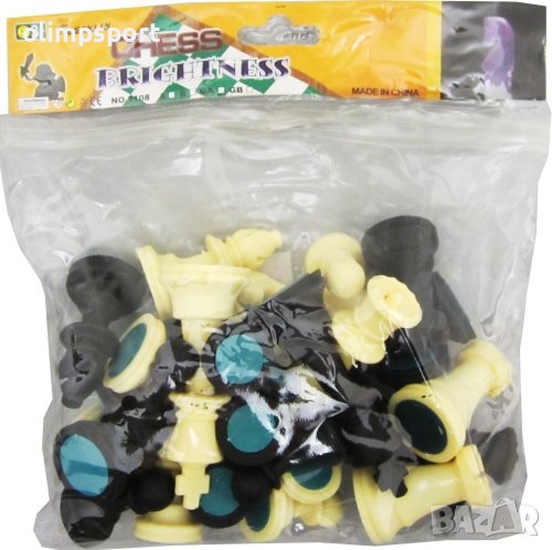 Комплект фигури за шах. Р-р цар: 9см. Р-р пешка: 4 см. Фигурите разполагат със защитна лепенка от долната страна против пързаляне. Материал: пластмаса. Комплектът включва платно за игра от фолио с размери 41х41см. Комплектът съдържа и удобна чанта за пренасяне и съхранение на фигурите. Тегло за 1 к-кт: 300г.