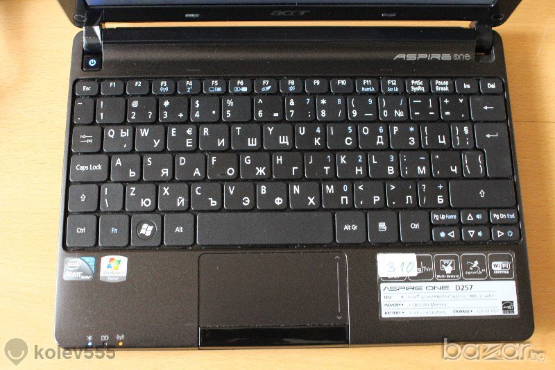 Между другото, ето ги и техническите данни на модела. Тип: Нетбук, Серия: Aspire One D257. Процесор двуядрен Intel Atom N2600 1.6GHz, 2MB Cache. Размер на паметта: 1 GB, Памет тип: DDR3. Твърд диск: 250 GB. Дисплей: 10.1" (1024 x 768) Acer Cine Crystal LED LCD матова матрица, която е много по-практична, не изкривява образа и светлината срещу екрана не рефлектира върху зрението. Видео: Intel Graphics Media Accelerator 3150 (Intel GMA 3150), with 128 MB dedicated memory, supporting Microsoft. Звукова карта и вградени стерео колонки Integrated speaker, Integrated microphone, Microsoft DirectSound compatibility. Безжична мрежа: WiFi 802.11n, Bluetooth. Мрежа: LAN 10/100. Интерфейс: 3 x USB 2.0 ports 1x VGA port 1x RG45 Headphones/ speaker /line-out Microphone /line-in jack. Web камера: 0.3MPx. Четец за карти: 5-in-1 card reader. Батерия: 3 cell Li-Ion 4h. Тегло: 1.15 кг.