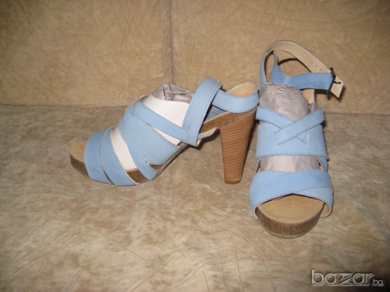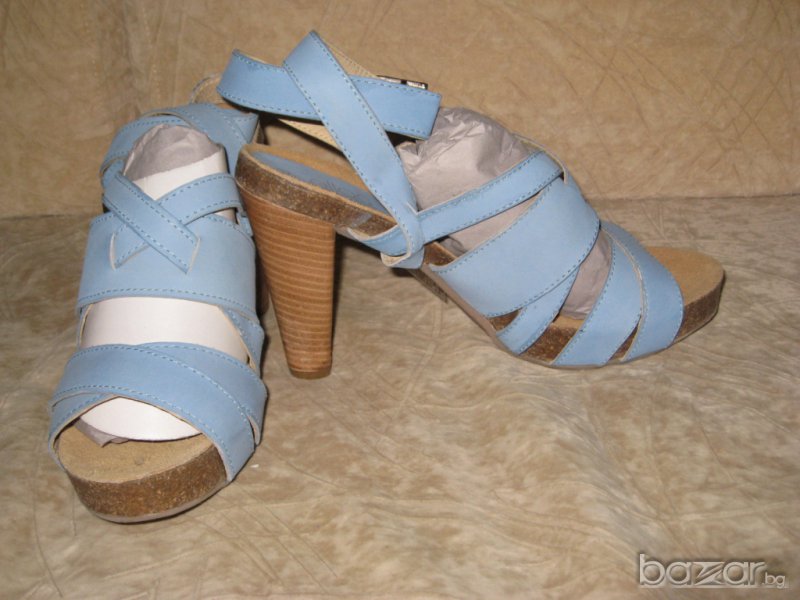 Светлосини сандали на ток изцяло от естествена кожа.Сандалите са на френска марка.Височина на платформата 1,5 см,височина на тока 7 см.