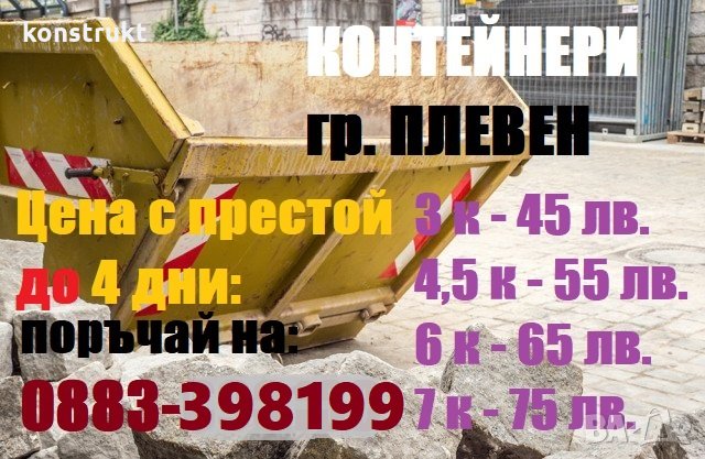 ЦЕНИ на Контейнери за строителни отпадъци в Плевен, контейнери за битови отпадъци, контейнери за промишлени отпадъци, зелени отпадъци, метални и други отпадъци (с престой на адрес до 4 дни):