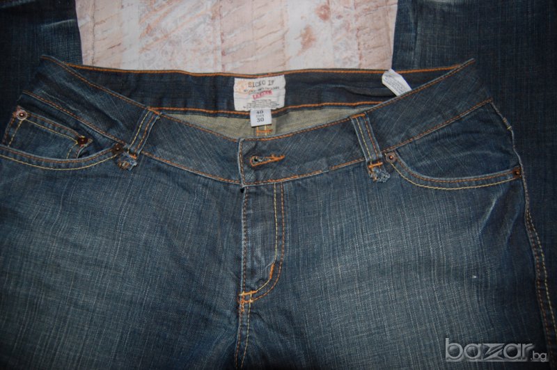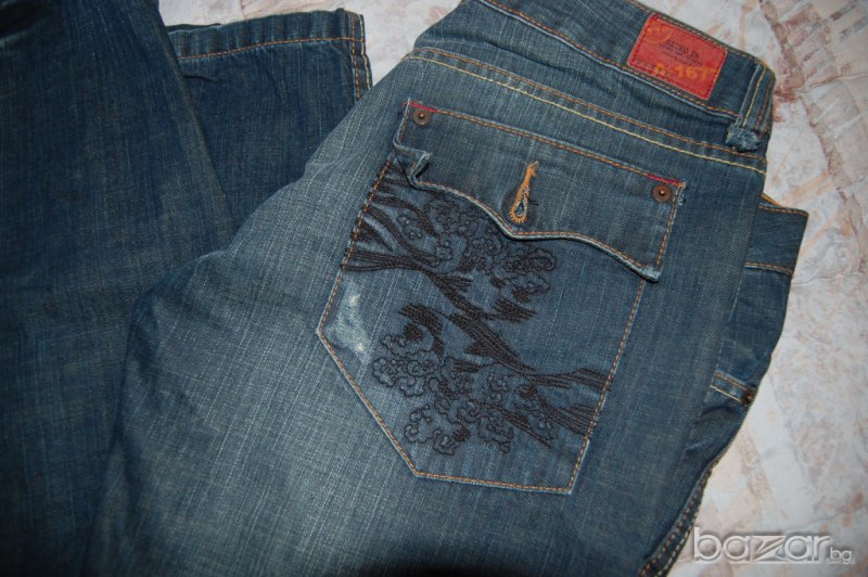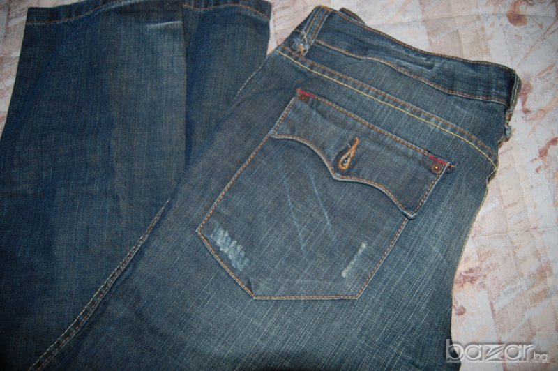 РРеално дънките са почти нови. Обувала съм ги веднъж, но са с ниска талия, с която така и не свикнах. Дължина 101см, четал 81,5см, дълбочина 20.5см. Талия (ниска)-95см, ханш-106. Еластан няма, 100% памук.