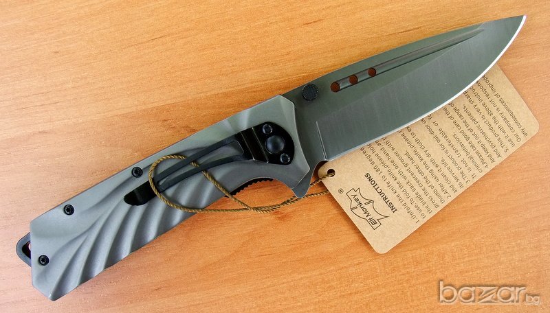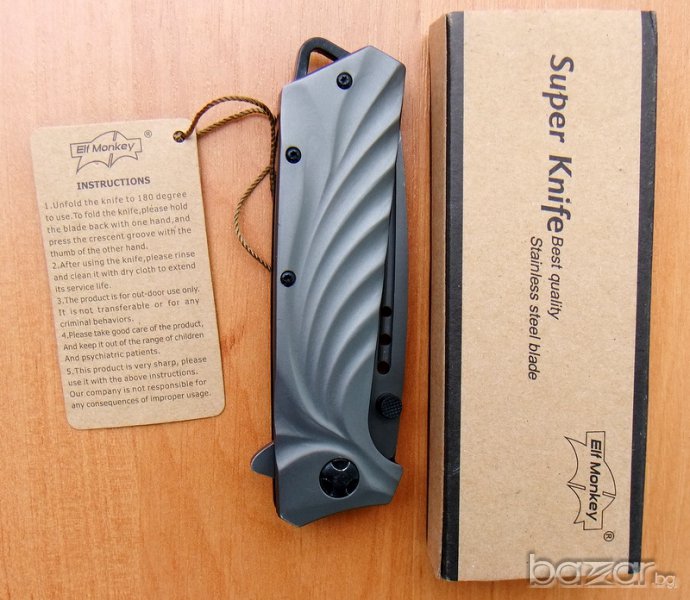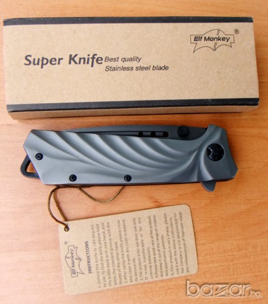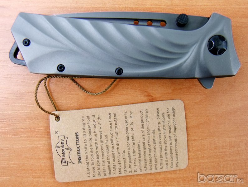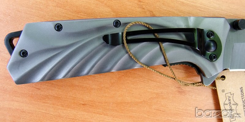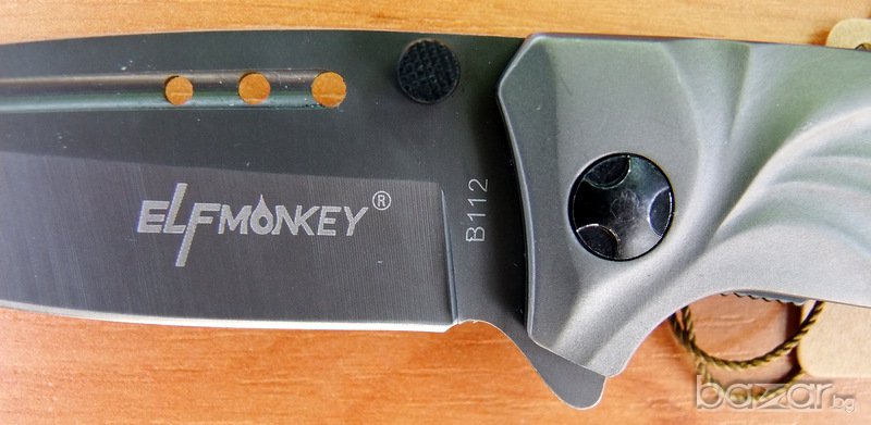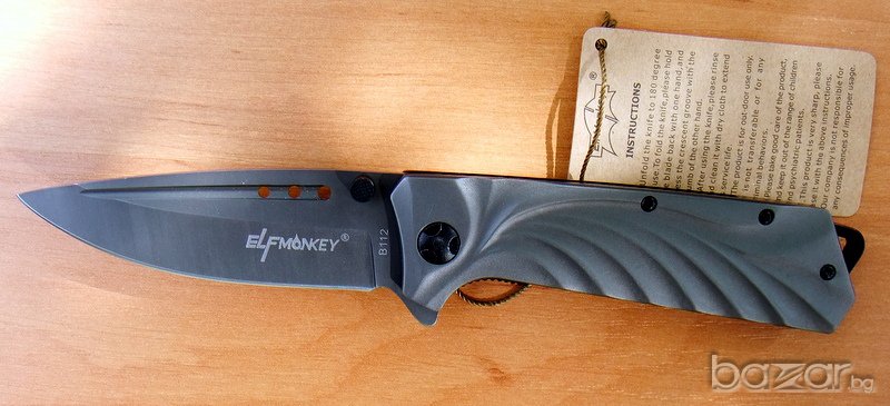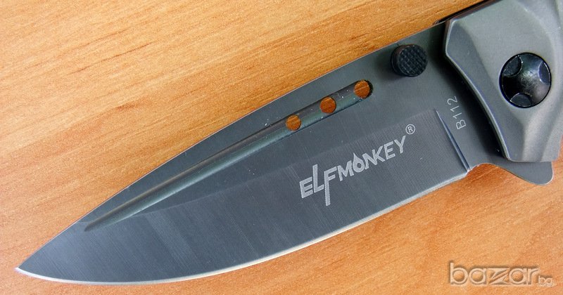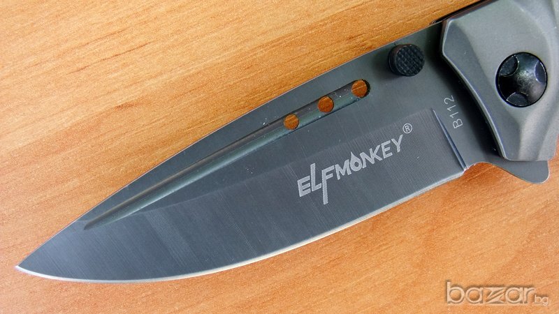 сгъваем нож Elf Monkey, идеален нож за ежедневно носене.Ножът е изцяло с матово сиво покритие. Острието е изработено от неръждаема стомана и е снабдено с два щифта. Ножът е с асистирано отваряне, което прави отварянето лесно и бързо. Дръжката е елегантно нагъната, а в края на метална скоба за носене на ножа на на ремък. Острието се блокира и е фиксирано в отворено състояние посредством система за заключване linerlock.Ножа има клипс за носене на колан.