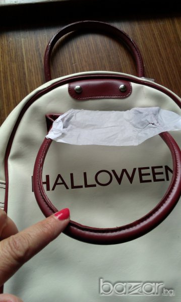Уникално красива чанта HALLOWEEN с размери 26/30 см. – с две къси и една дълга подвижна дръжка. Ширина на дъното-13 см. Цвят бледо бежово с вишнево. Вътрешен джоб с цип.