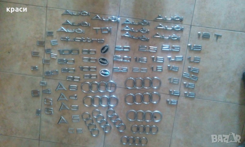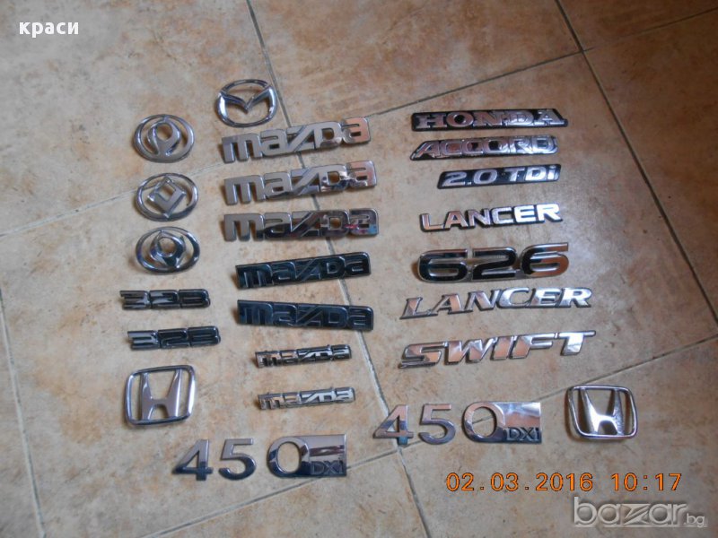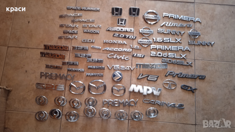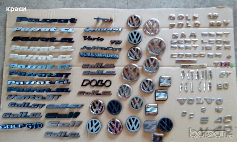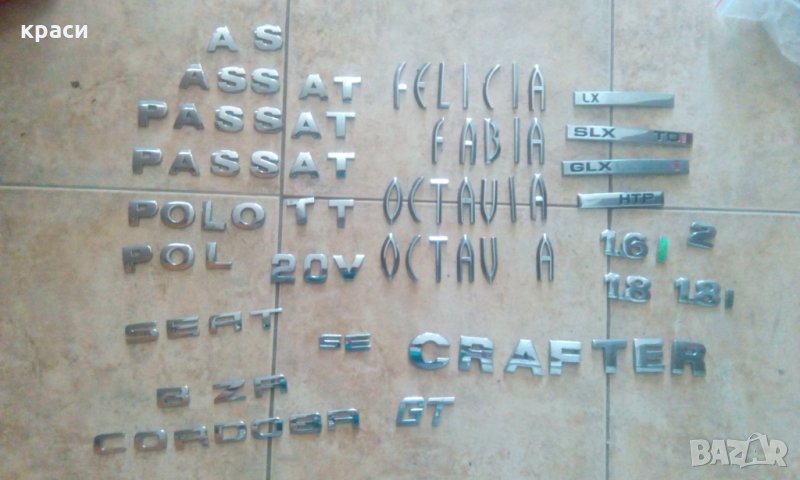 оригинални емблеми и надписи ВТОРА УПОТРЕБА !!!!!!! емблеми за рено -10лв бр // надписи еспейс 3 -10лв / лагуна 97г -10лв / 01г -15лв / меган -10лв / 19 -10лв / сафран -10лв / клио 93г / 99г -10лв / "сценик" 05г -20лв / "еспейс" 05г -20лв / "лагуна" 03г -20лв / надпис "рено рапид" -15лв к-кта /// емблеми нисан 91г-00г -20лв бр /// надписи "нисан пРимеРа / съни" -15лв бр /// надписи ауди 80/90/100 -10лв бр // А3/А4/А6 -10лв бр /// емблеми АУДИ 18см -15лв бр /// емблема АУДИ за калник -10лв бр /// надписи ПАСАТ 20 V / ПОЛО 1.8 / 2.0 -15лв /// надпис "ФЕЛИЦИЯ" -15лв /// емблеми МЕРЦЕДЕС W201/124 -15лв / надписи -15лв бр // надписи МЕРЦЕДЕС А140-160-200-210 -20лв бр /// надпис AMG -40лв // CLA 45 -40лв // ML430 -40лв // ОПЕЛ емблеми никелирани -15лв бр и надписи 1.2 - 1.4 - 1.6 - 1.8 - 2.0 - 2.2 -10 лв бр /// надписи CD / GL -10лв бр // ГСИ -15лв бр /// ОПЕЛ омега А надпис -15лв к-кта / надписи опел -15лв бр / надписи астра - вектра - корса - фронтера - омега -15лв бр // емблеми ФОРД -- 8/9/9.5/11.5см -15лв / 14.5см -15лв бр / надпис "фиеста" 02г -20лв / надпис "фиеста" 98г -15лв /// емблеми "джия" -15лв бр /// БМВ емблема -15лв / надписи за БМВ -20лв /// емблеми и надписи за ФВ пасат 2-3 /голф 2-3/джета 2 -10лв бр /// емблеми РОВЪР -15лв / надписи -15лв бр /// АЛФА РОМЕО 146/156 надпис -15лв к-кта --- емблеми АЛФА РОМЕО -20лв /// надпис "ПУНТО" 03г -20лв // надпис ПЕЖО 306 95г -15лв бр /// СЕАТ кордоба-ибиза-толедо 94г емблема -10лв /// МАЗДА 323/626 емблеми -20лв / надписи -15/20лв бр /// надпис "ПЕЖО" -25лв / надписи 406 / 306 / 106 / 206 / 607 / 407 / 806 -15лв бр /// надписи "СИТРОЕН ксантия / ксара / саксо -15лв бр /// надпис "2,0" -10лв бр / "ХМ" / ЗХ -10лв //// емблема ЛАНЧИЯ -10лв /// надпис от КИА "сепия" -10лв /// емблема ФИАТ -10лв / надписи "ФИАТ" -10лв бр /// емблеми ХЮНДАЙ 9.5см -10/11.5см -25лв /// емблема киа червена 9см -15лв /// емблема КРАЙСЛЕР -15лв /// емблеми и надпис ДЕУ ланос/матиз -15лв бр /// надпис "ХЮНДАЙ соната" -10лв бр /// надпис "NOS" -10лв /// надпис ВОЛВО -15лв / S/V 40 1.8 - 2.0 -15лв /// надписи спейс стар / рънер / вагон -20лв бр // емблеми и надписи за хонда -25лв бр -----------