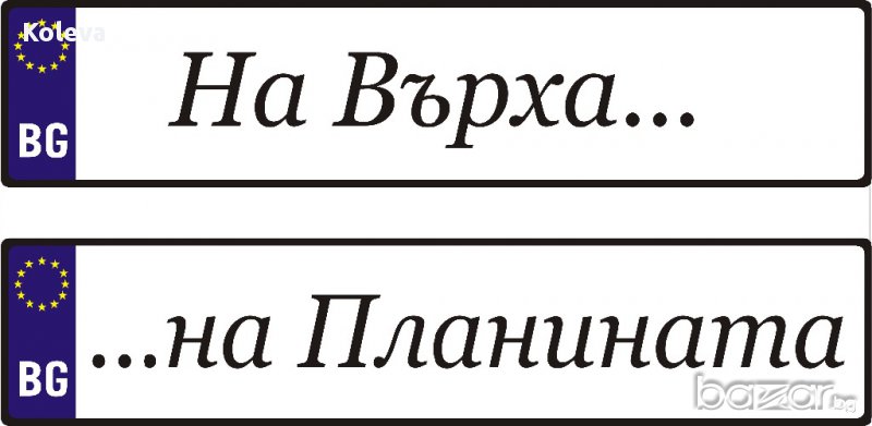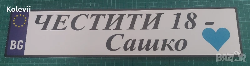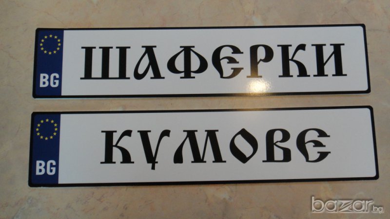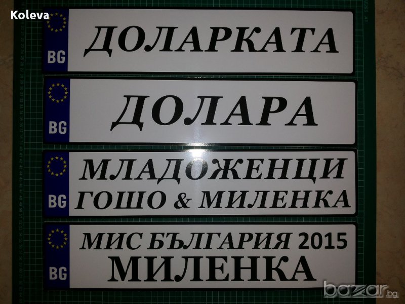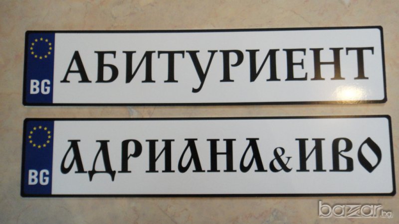 Материала е ПВЦ 3 мм. , а не само фолио. Изработваме и по индивидуални проекти в зависимост от вашите желания - поименни, кръстници, абитуриенти, шафери и други, Размера е като на оригиналните 52 х 11.5 см."Младоженци" са налични. За другите с ваш текст срока на изработка е 1-2 дена.Цената е 15.00 лв. за брой.