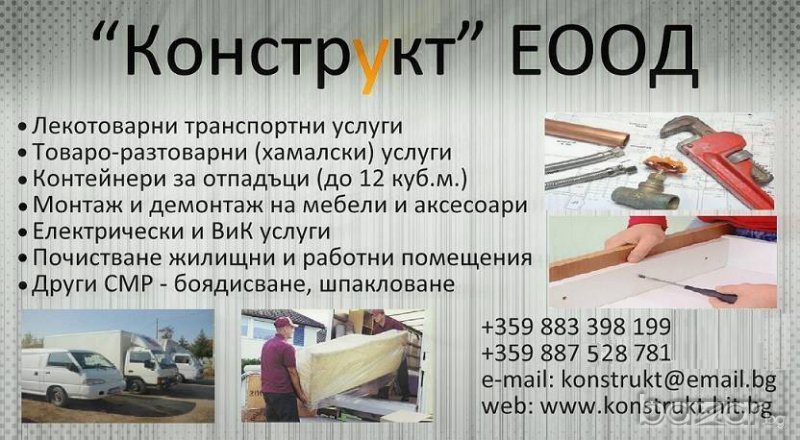 Плевен. Конструкт ЕООД. Сглобява мебели, Демонтаж мебели, Хамалски услуги, Транспорт – топ цени прем