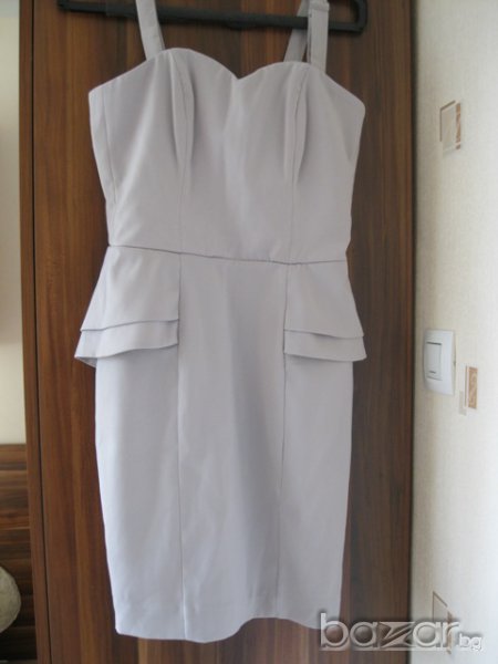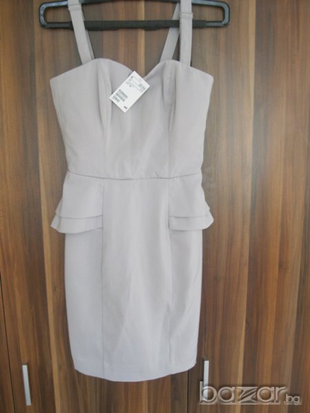 Уникална " H&M " Нова рокля с етикета тип пеплум. Цената на която съм я купила се вижда на етикета....Дължина от подмишници- 66 см; ширина под мишници- 37 см; ширина талия- 32 см; ширина ханш- 44 см.Презрамките са като на сутиен, корегират се и се свалят от роклята. Отзад е със златен цип, а отдолу с подплата.Мерките са едностранни, взети със шивашки метър от шев до шев.