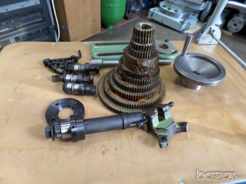 Комплект Лира за универсална фреза ФУ 321. Комплектът се състои от зъбни кола, опорни ОСи, фиксираща плоча и преходен фланец за присъединяване на универсален патронник.