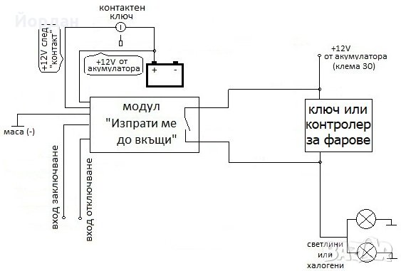 Модулът се свързва в 5 точки от автомобилната ел. инсталация: +12V от акумулатора; +12V след "контакт"; маса; светлините, които ще бъдат управлявани от модула, и ключалката или алармената система на автомобила. При подаване на заключващ или отключващ импулс на някой от входовете, модулът включва светлините и ги изключва след настроеното време. Предлагания модул може да работи и с положителни, и с отрицателни управляващи импулси. Времето за светене може да се настройва от няколко секунди до една минута.